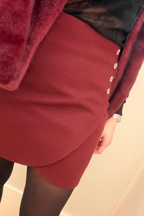 Go for a bold style by pairing this skirt with a soft sweater and tall boots. Perfect for winter! • Short skirt • Wrap style • Decorative buttons • Vibrant red • Soft material