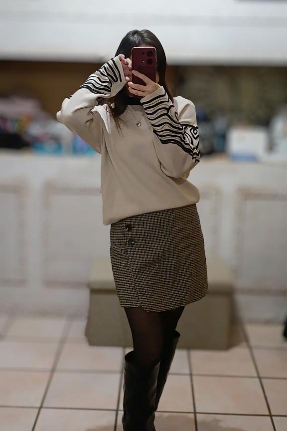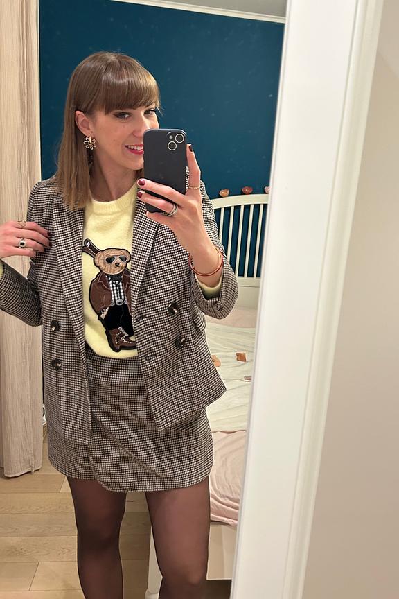 Pair this skirt short with a cashmere pull for a chic and cozy winter look. Add leather ankle boots for a touch of modern elegance. • Short skirt • Draped for a sophisticated look • Decorative buttons for a unique touch • Trendy print for a timeless vibe • Material blend for extra comfort
