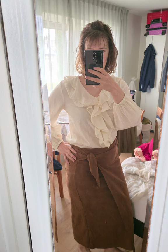 Pair this skirt with a white blouse and ankle boots for a chic winter look. • Long faux suede skirt in camel color • Wrap cut • Elastic waist • Side slit