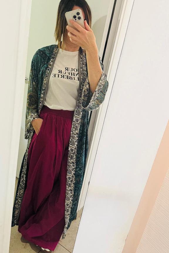 “A bit tight in size, nice loose fit, beautiful drape but wrinkles quickly. It doesn’t have the same effect at the end of the day, it’s a shame. Otherwise, magnificent color and original cut: a standout piece for a striking look!”