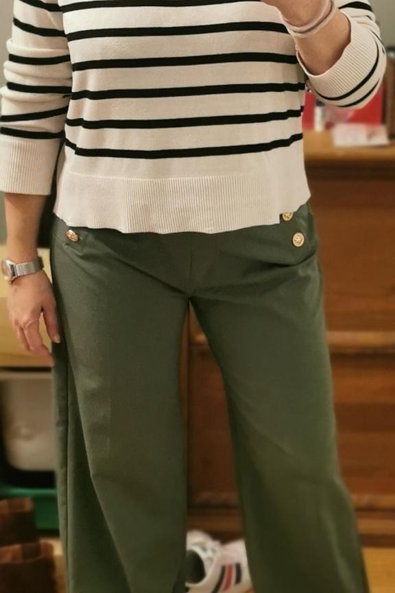Pair these green pants with a fitted top in neutral tones and some gold jewelry to create a chic and contemporary look. Perfect for any season. • Flared pants • Mid-rise cut • Wide legs • Button closure • Gold button details
