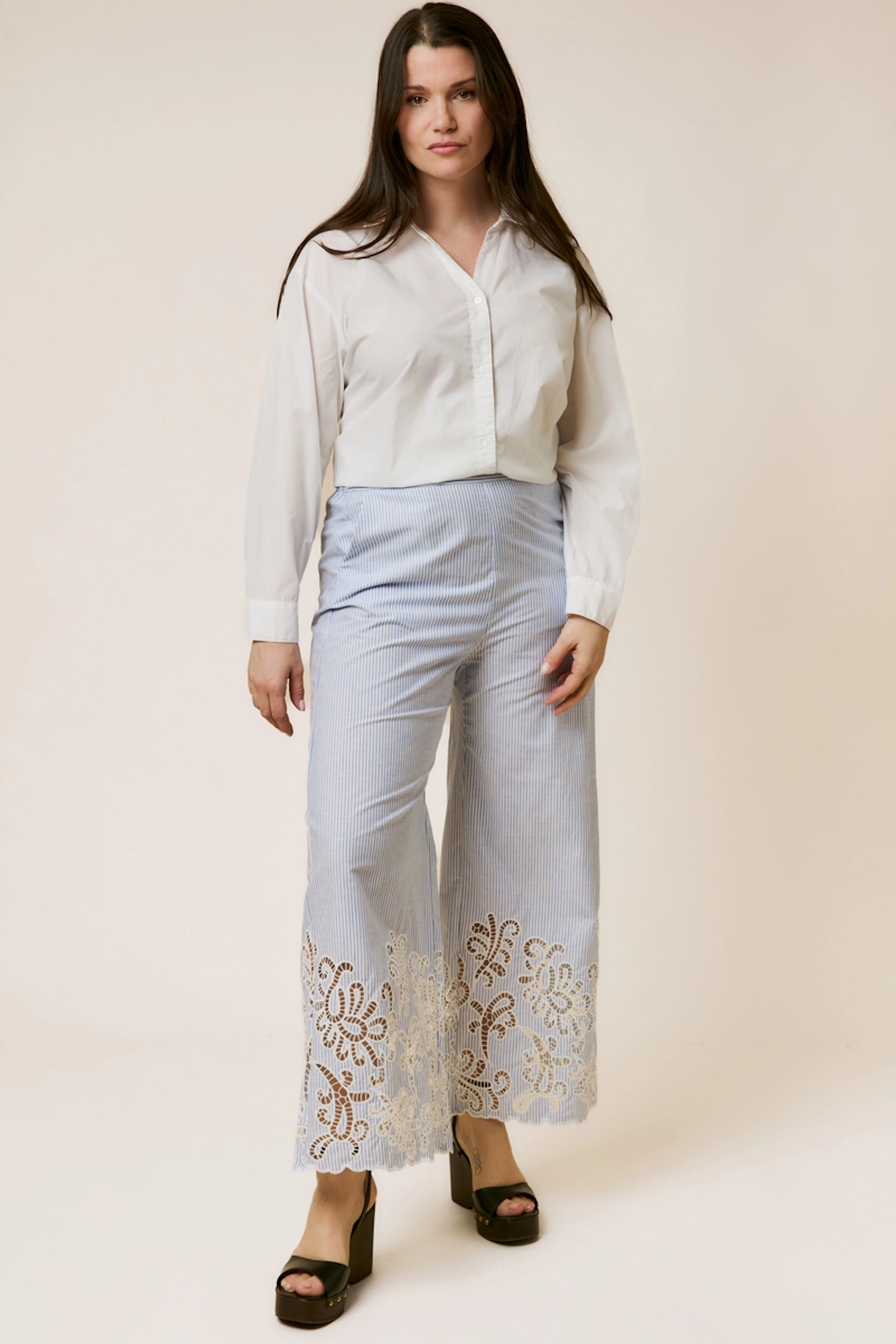 Pair these pants with a lightweight linen top for a refined summer look. Perfect for those sweet summer evenings. • Wide-leg pant • Flattering high waist • Striped pattern • Delicate lace at the bottom • Flared with a boho touch