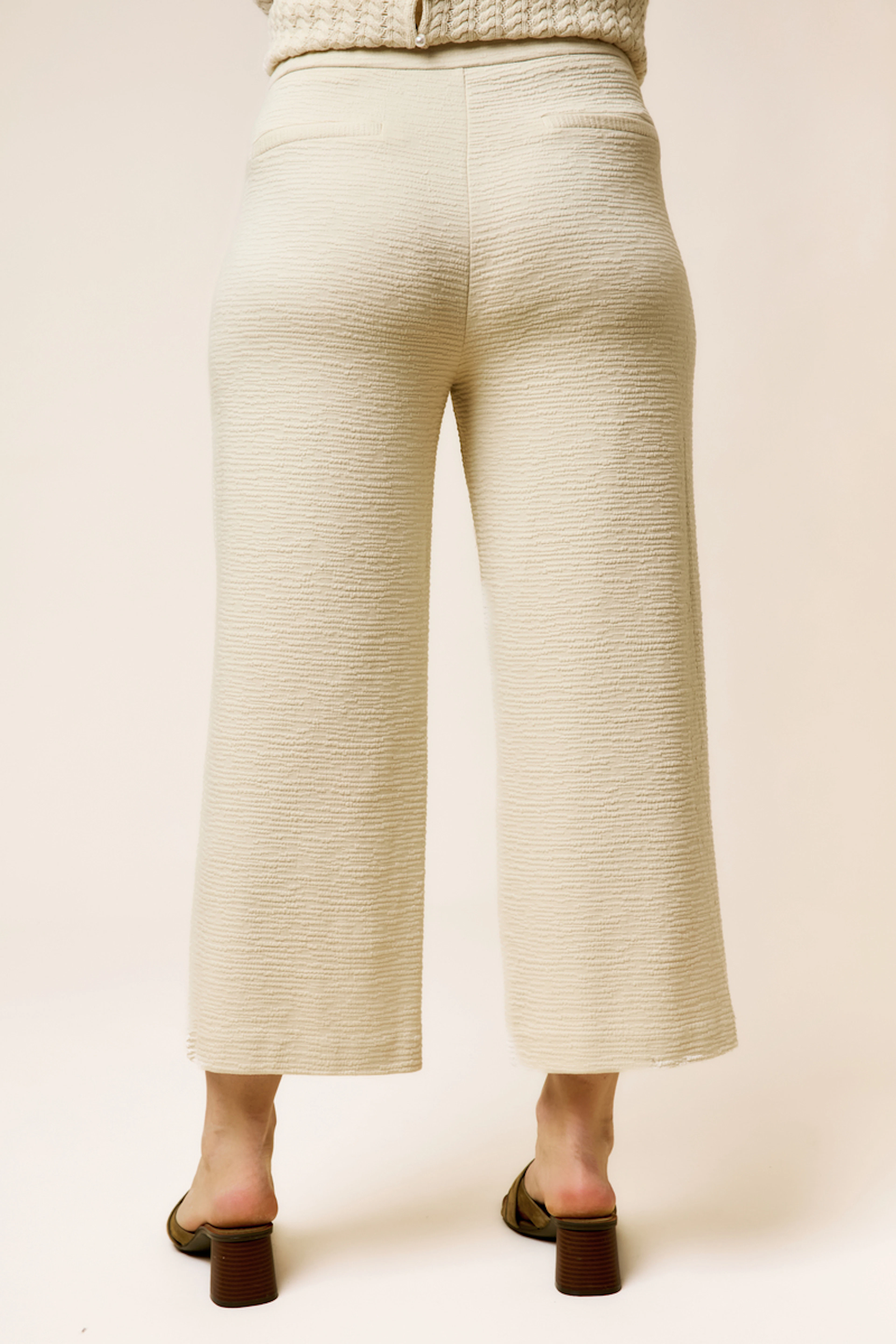 Pair these beige pants with a colorful top and sandals for a modern summer twist. Perfect for sunny days. • Loose and fluid cut • Elasticized waist • Ankle length • Front patch pockets • Textured fabric