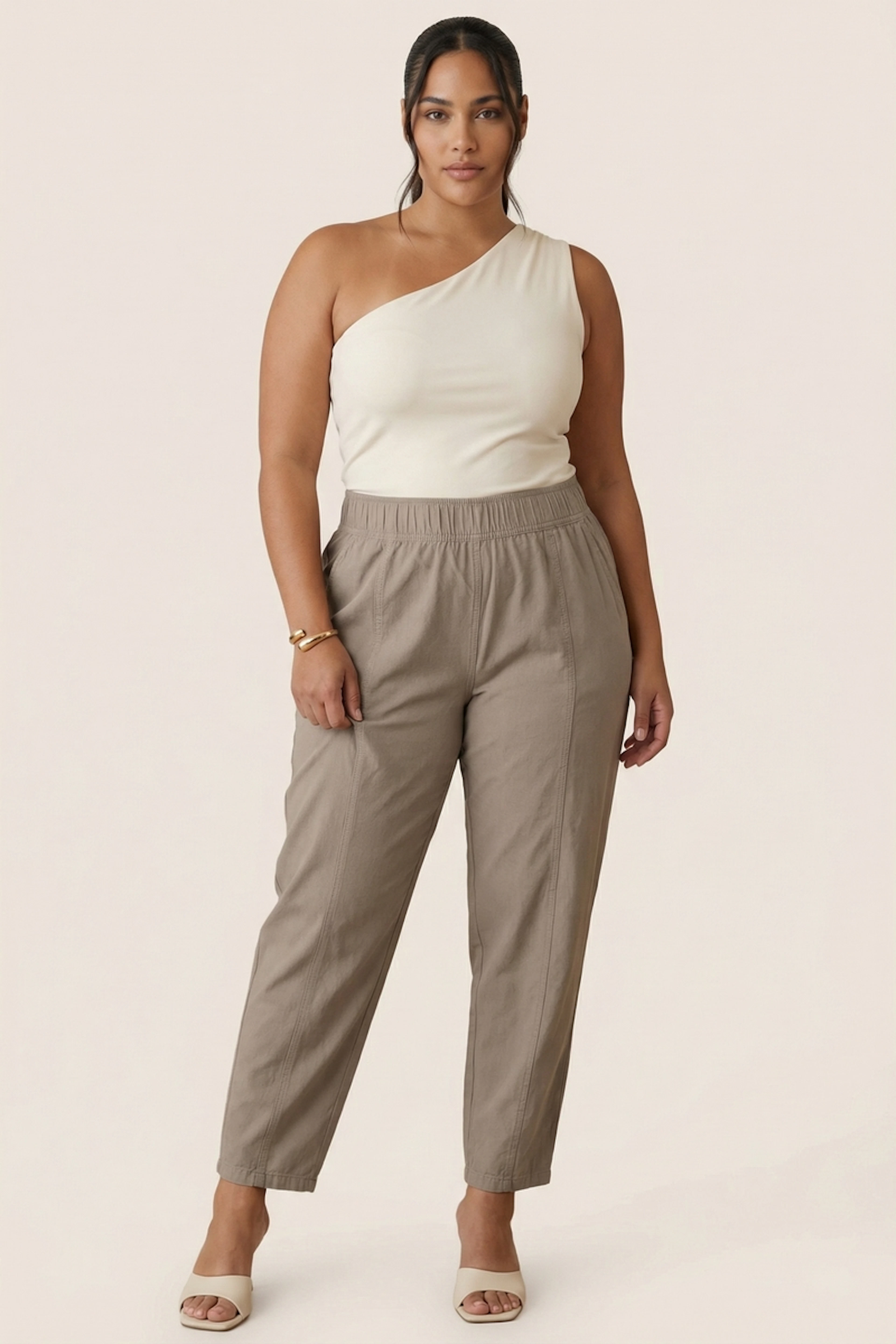 Style this pant with an off-shoulder top and some leather sandals for a chic summer vibe. • Cotton pant • High elastic waistband • Straight leg • Ankle length • Decorative stitching