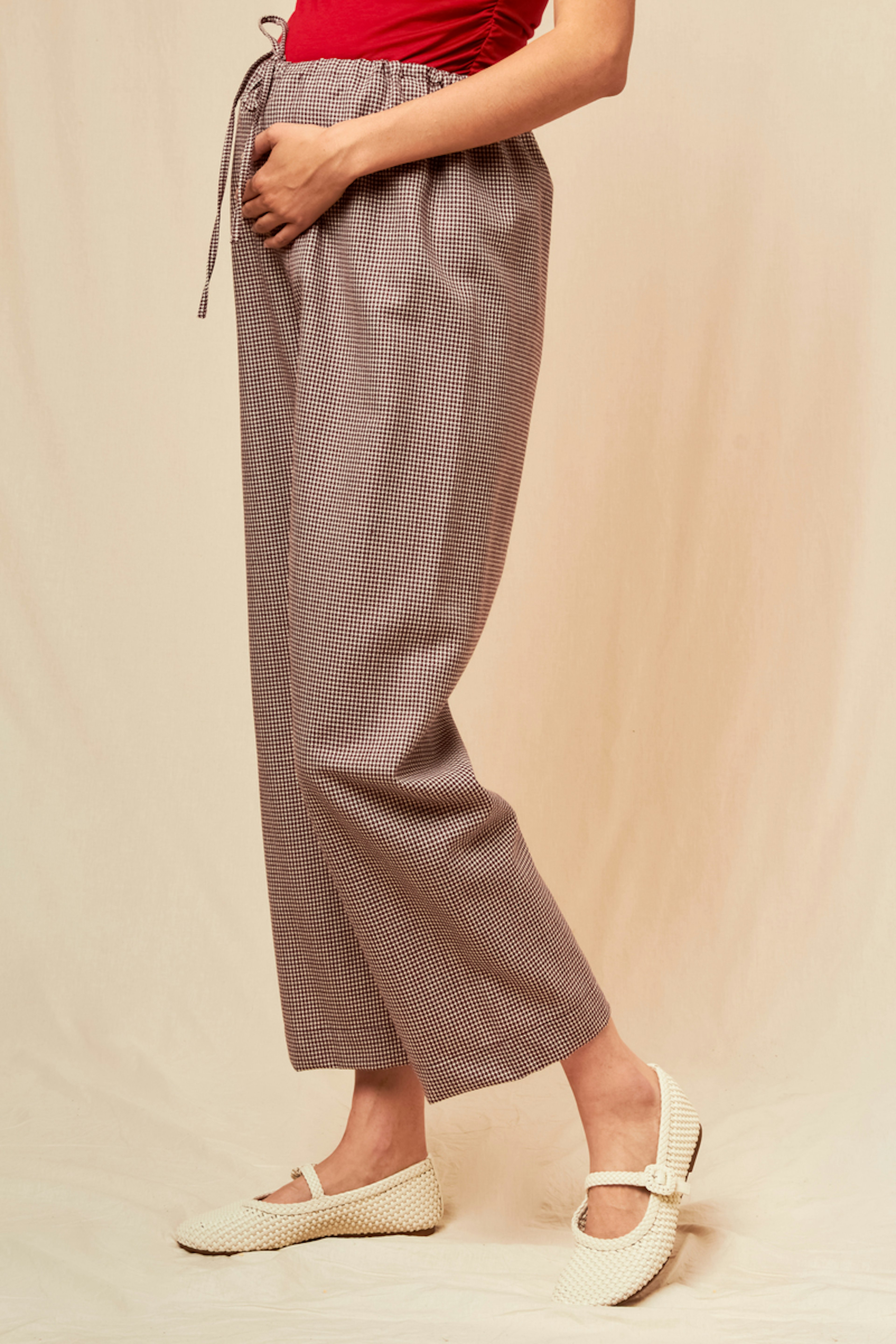 Pair these elegant pants with a flowy silk top and loafers for a chic and comfortable look, perfect for all seasons. • Wool pants • Flattering wide cut • Practical elasticated waist • Loose length • Classic printed pattern