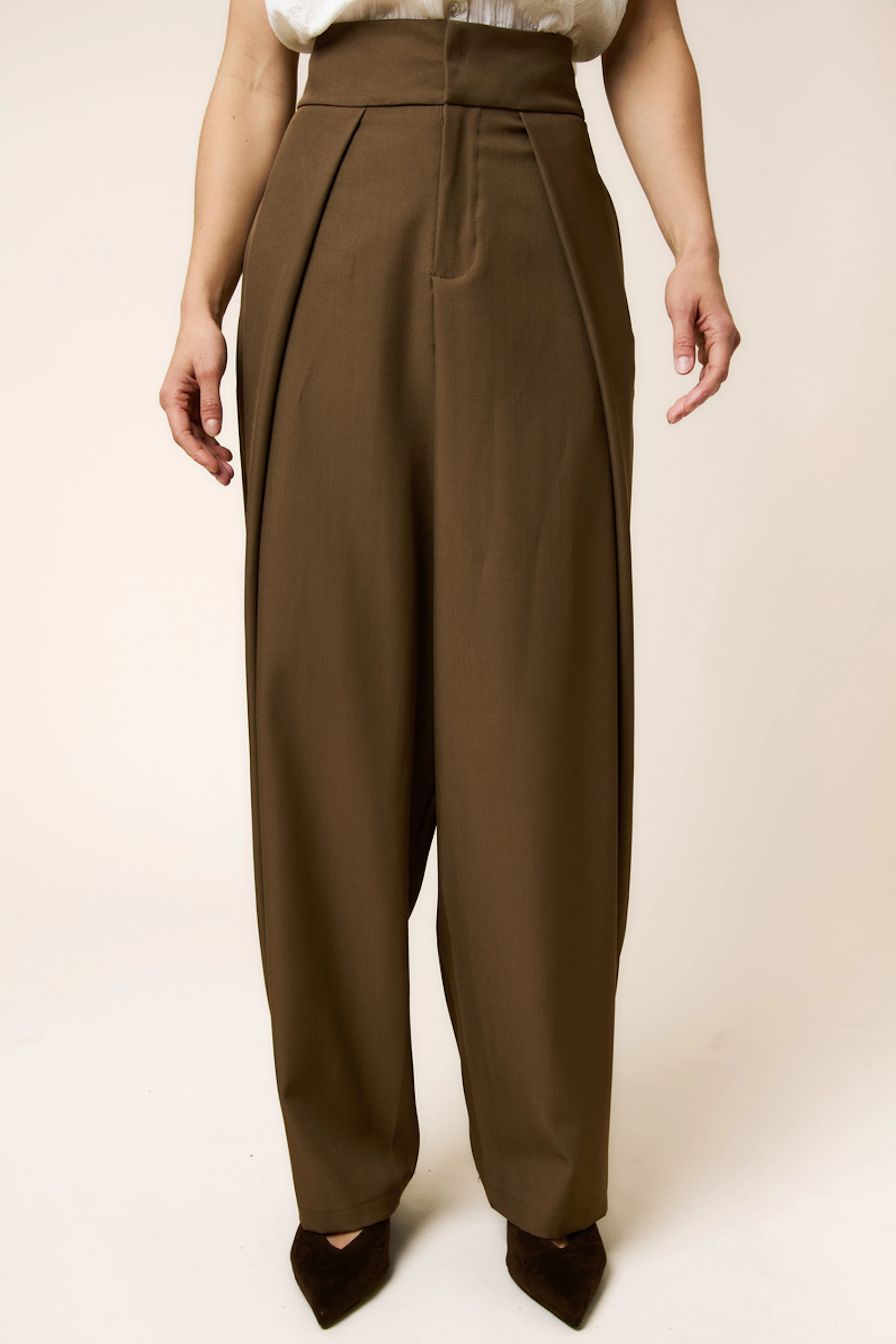 Add a chic touch with golden accessories and leather sandals for that timeless look.\n\n• Wide-leg pants\n• Flattering high waist\n• Elegant front pleats\n• Flowing wide length\n• Sophisticated brown color
