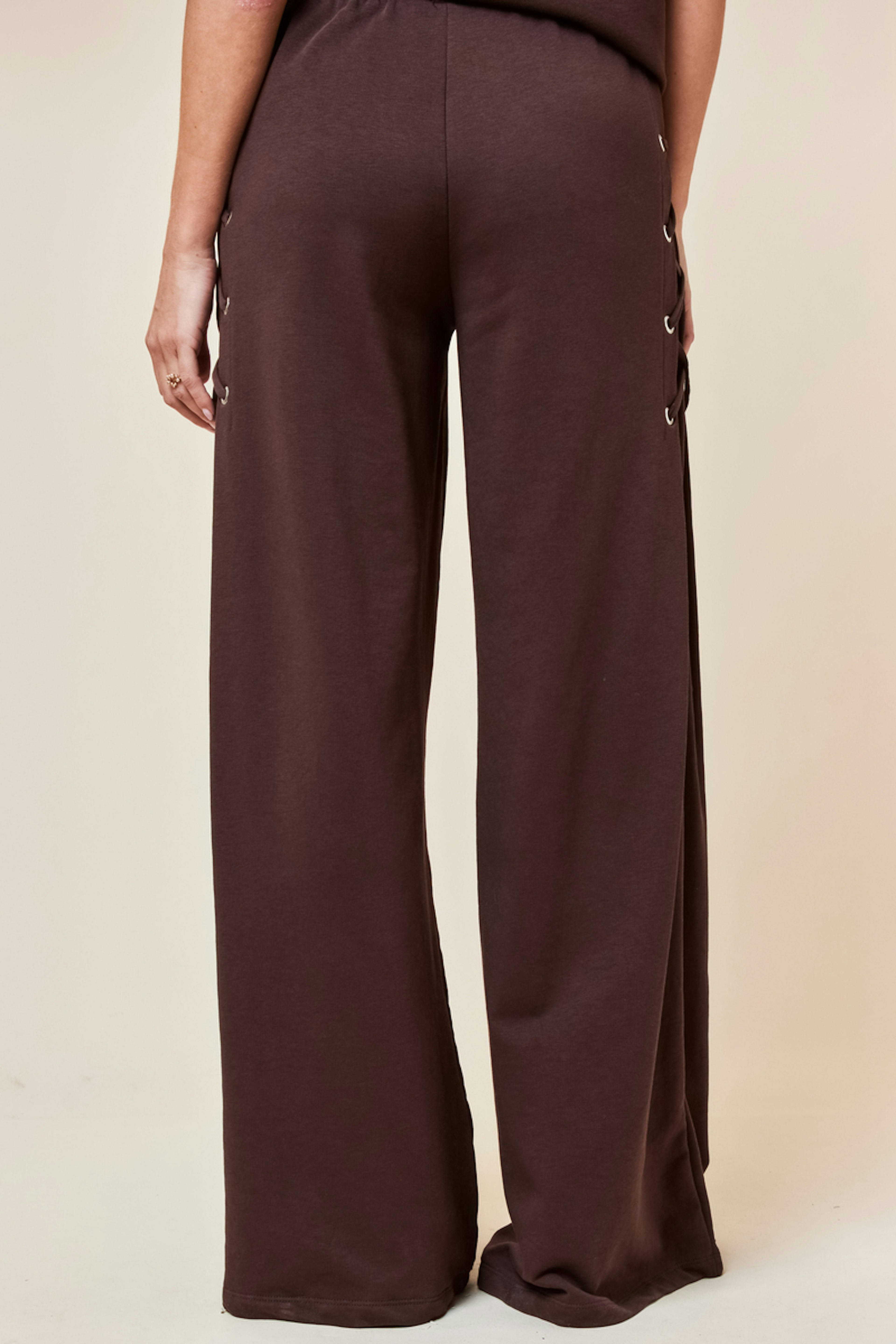 Go for a laid-back vibe with white sneakers and a trendy hat for an urban style. • Loose pant • Elastic waistband • Lace detail on the sides • Straight fit • Perfect for a casual look