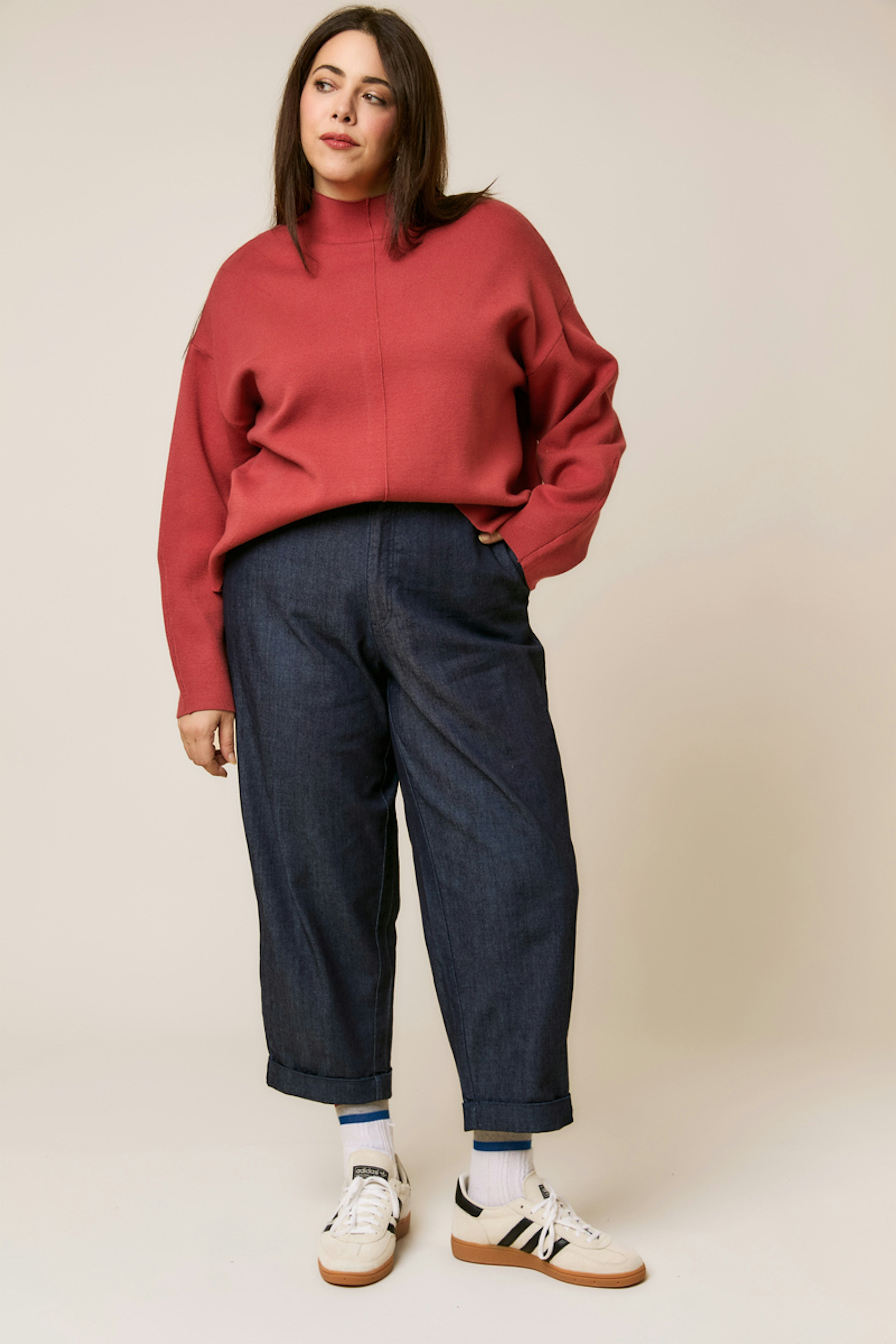 Pair this red pull with black jeans and ankle boots for a chic and warm winter look. • Long sleeve pull • Oversized fit • High collar • Decorative central seam • Soft and comfortable texture