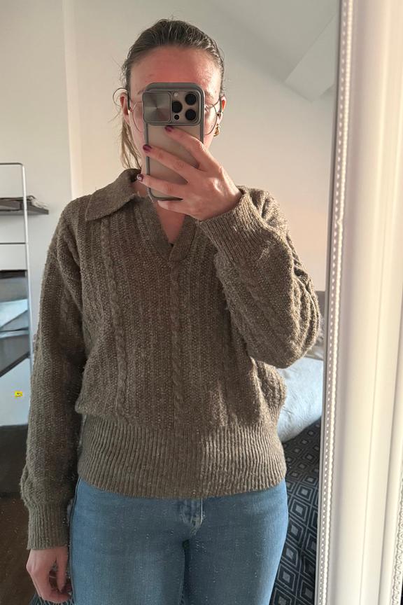 Wear this pull with a leather skirt and ankle boots for a chic look this winter. • Mixed wool pull • V-neck • Shirt collar • Long sleeves • Cable knit