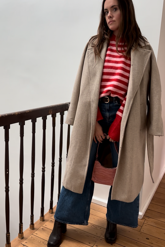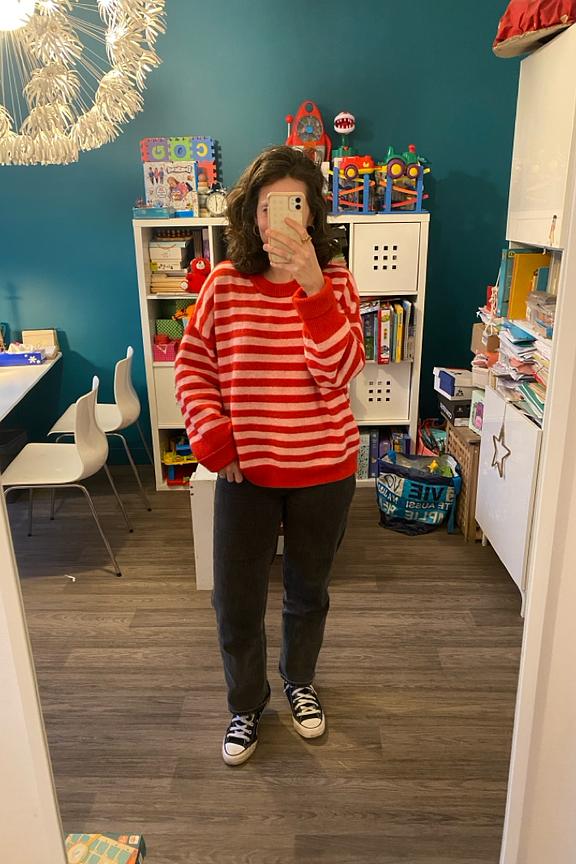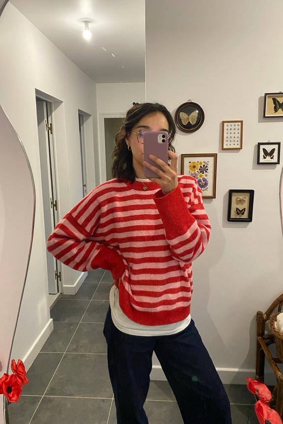 Pair this striped sweater with white jeans and ankle boots for a chic winter look. • Striped sweater • Relaxed fit • Long sleeves • Round neckline • Red and white stripes