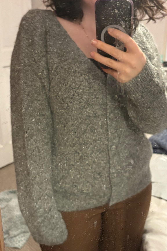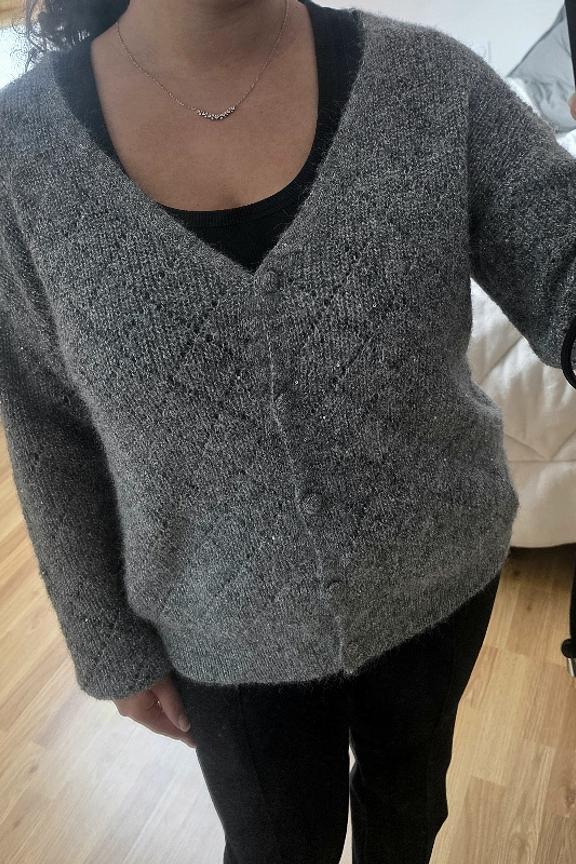 Combine this gray pull with fitted black jeans and ankle boots for a chic winter look. • Soft pull with wool and mohair • Flattering V-neck • Slightly oversized fit • Comfortable long sleeves • Refined button closure