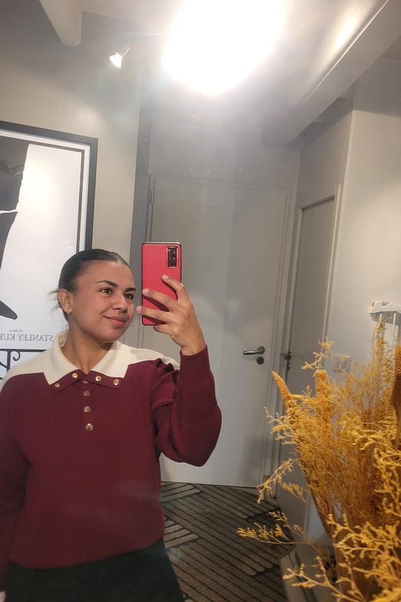 Combine this pull with raw jeans and ankle boots for a chic and laid-back winter look. • Panelled pull • Long sleeves • Decorative button placket • Contrasting collar • Gold button detail