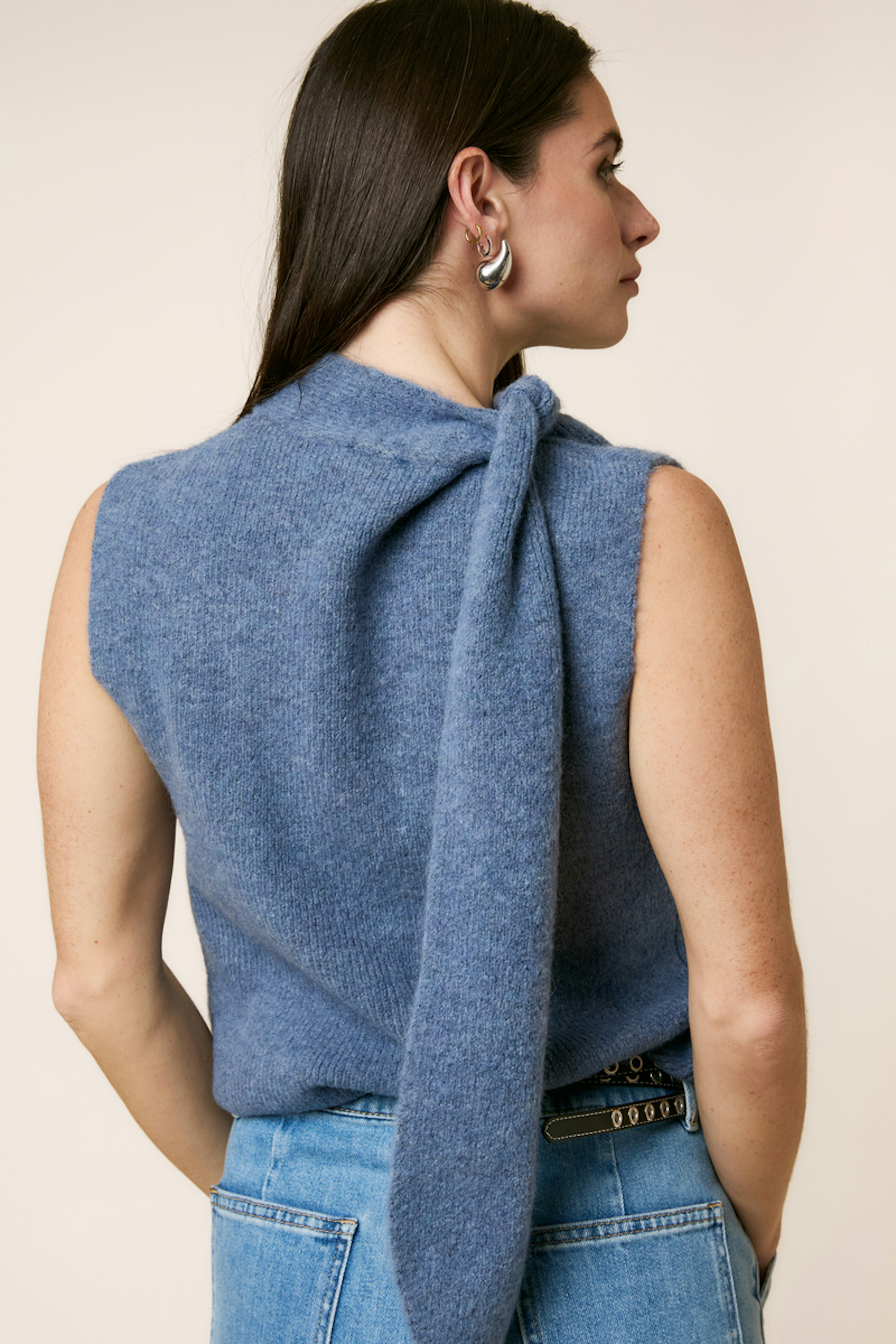 Pair this pull with black leather pants and ankle boots for a chic winter look. • Sleeveless pull • Turtle neck • Soft, warm fabric • Side ties for styling • Perfect for layering