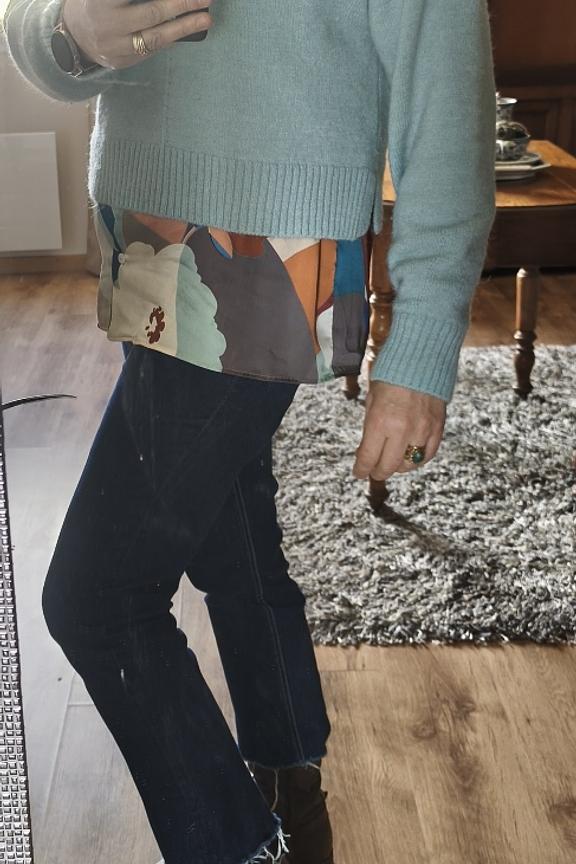 Pair this cozy pull with a leather skirt for a chic and relaxed look, perfect for winter days. Throw on some ankle boots and a trendy handbag. • High neck pull • Oversized long sleeves • Relaxed fit • Ribbed texture at the cuffs • Soft green hue