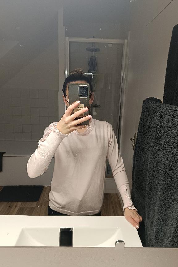 Pair this delicate sweater with white pants and sandals for a chic and effortless summer look. • Cashmere sweater • Moderate fit • Long sleeves • Lace details • Soft pink color