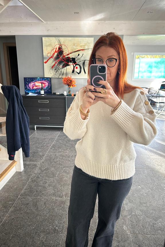 Wear this oversized sweater with fitted jeans and ankle boots for a perfect cozy-chic style for winter. • Loose sweater • Round neckline • Long sleeves • Gold buttons on the shoulder • Thick and warm knit