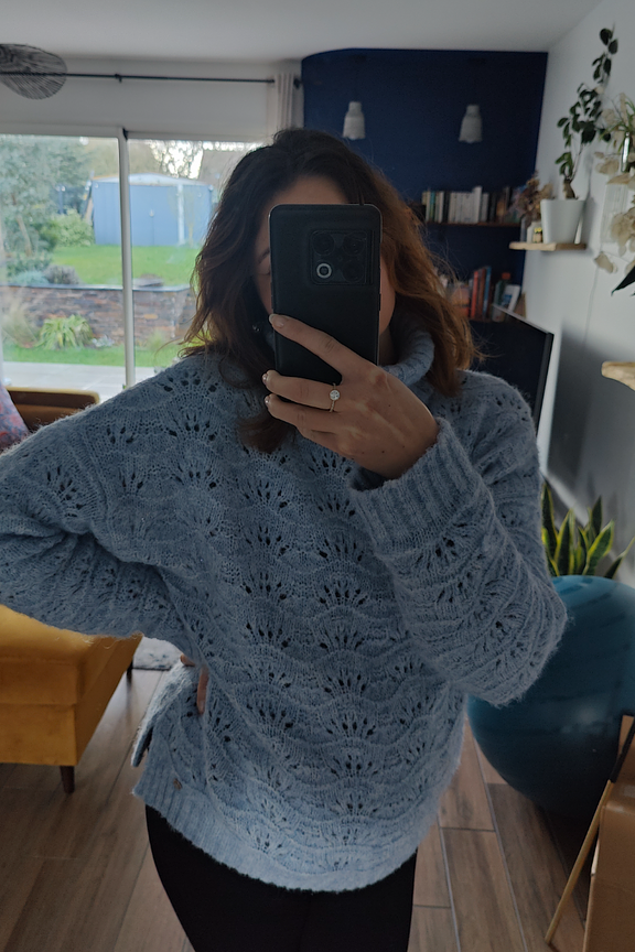 Pair this pull with dark skinny jeans and boots for a chic and cozy look this winter. Add a long coat to complete your outfit. • Crocheted pull • Long sleeves • Turtleneck • Loose fit • Elegant openwork pattern