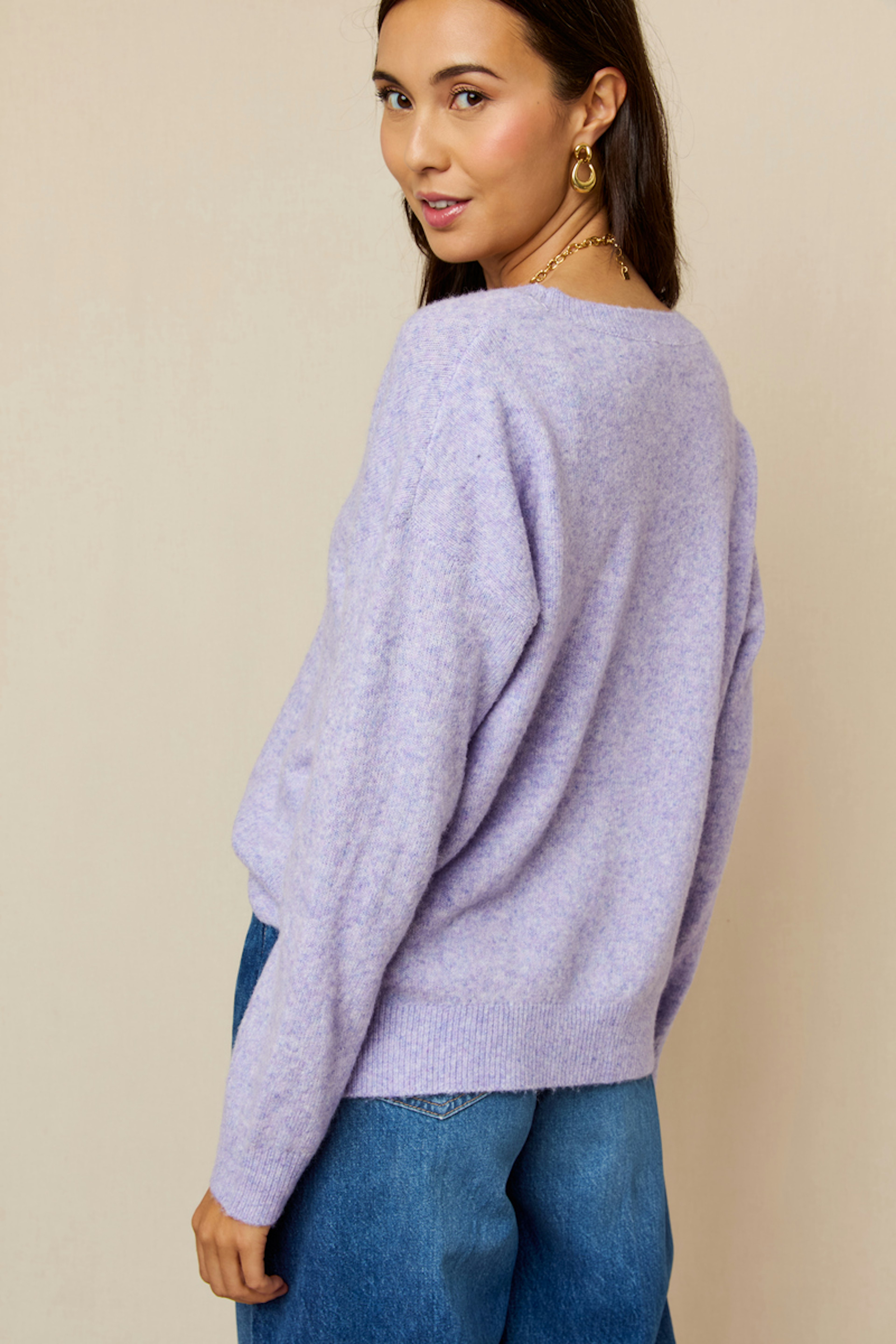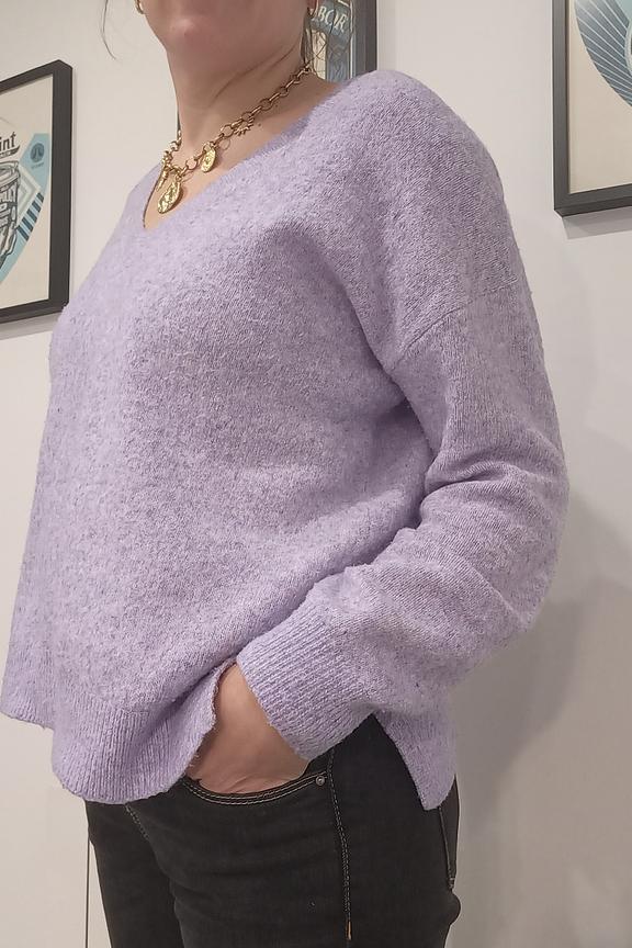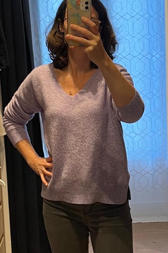 Add a touch of femininity to your look with a leather skirt and ankle boots. Perfect for winter walks in the city. • Comfortable pullover • Flattering V neck • Cozy long sleeves • Slightly loose fit • Soothing purple color