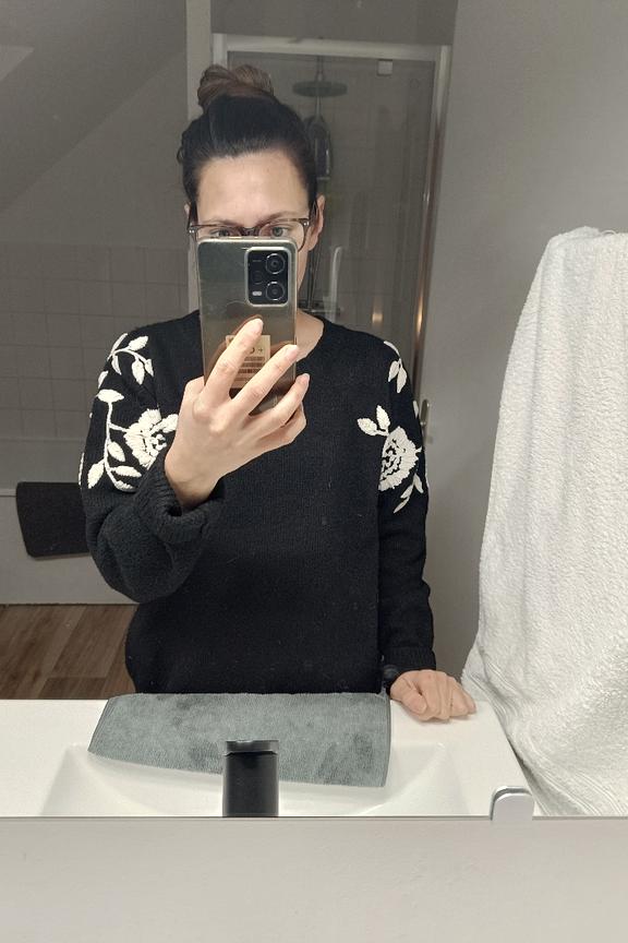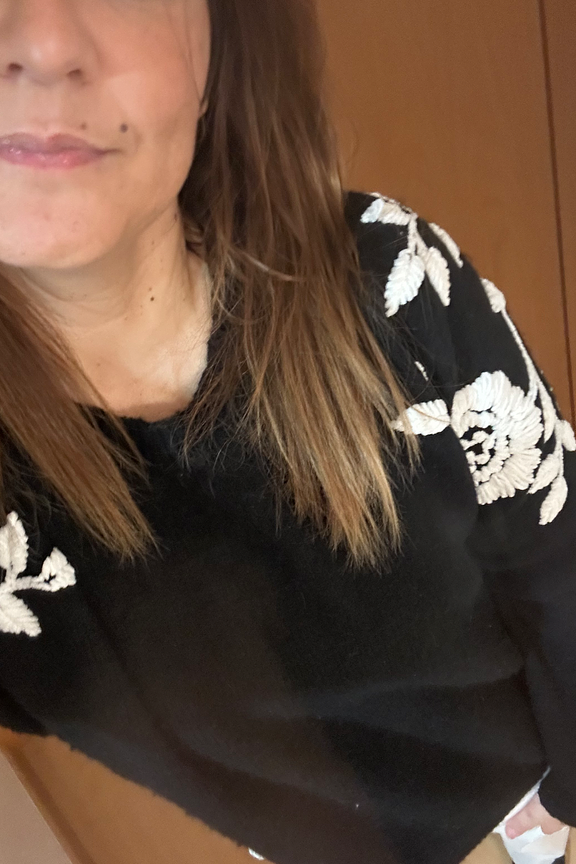 Refine your look with this chic pullover paired with white jeans and ankle boots for a sophisticated vibe. • Patterned pullover • Classic cut • Long sleeves • Round neckline • Embroidered floral pattern