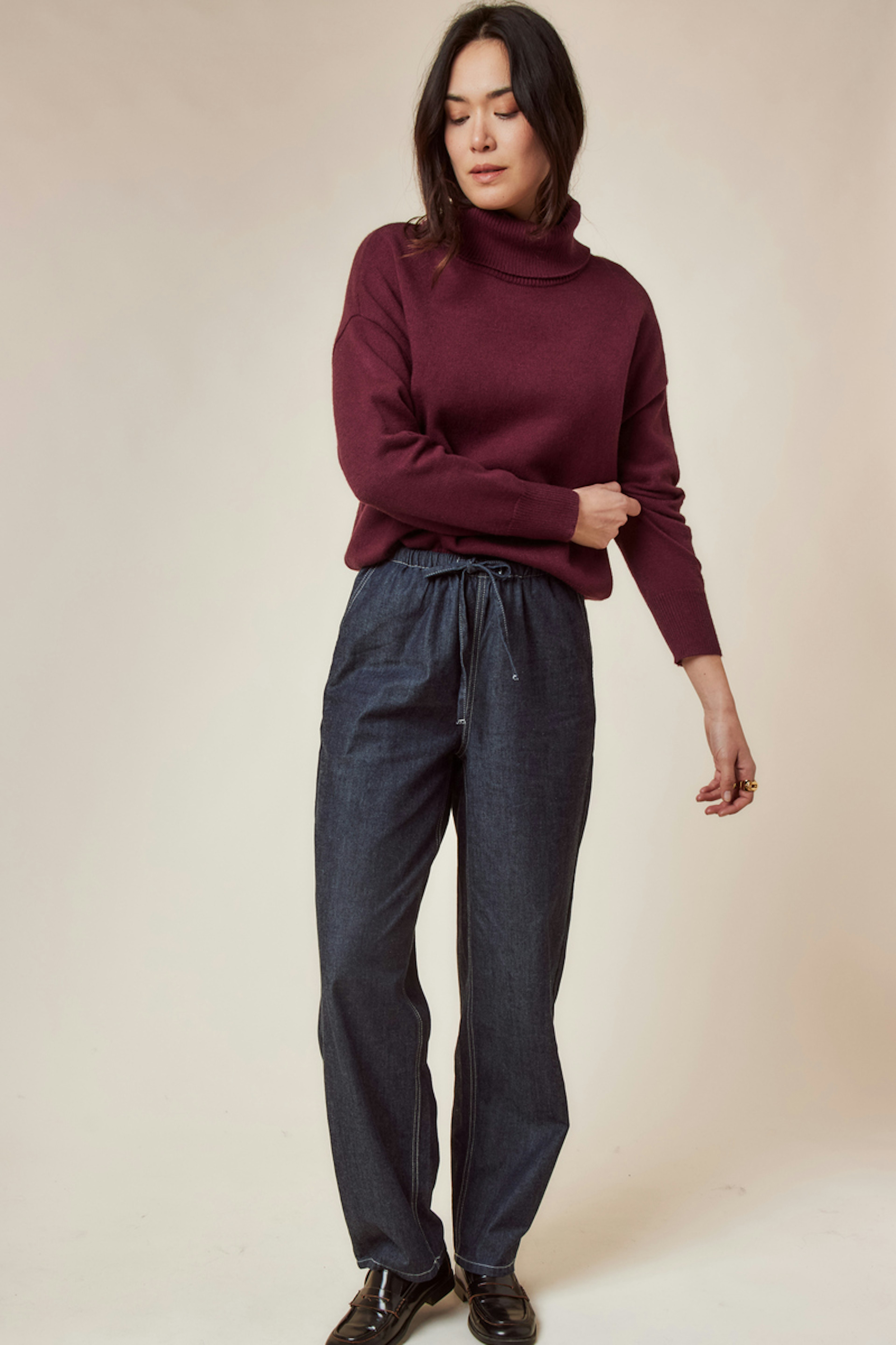 Opt for this cozy pullover with slim jeans and leather ankle boots for a chic and warm look, ideal for winter. • Turtleneck pullover • Loose fit • Long sleeves • Ribbed cuffs • Elegant burgundy color