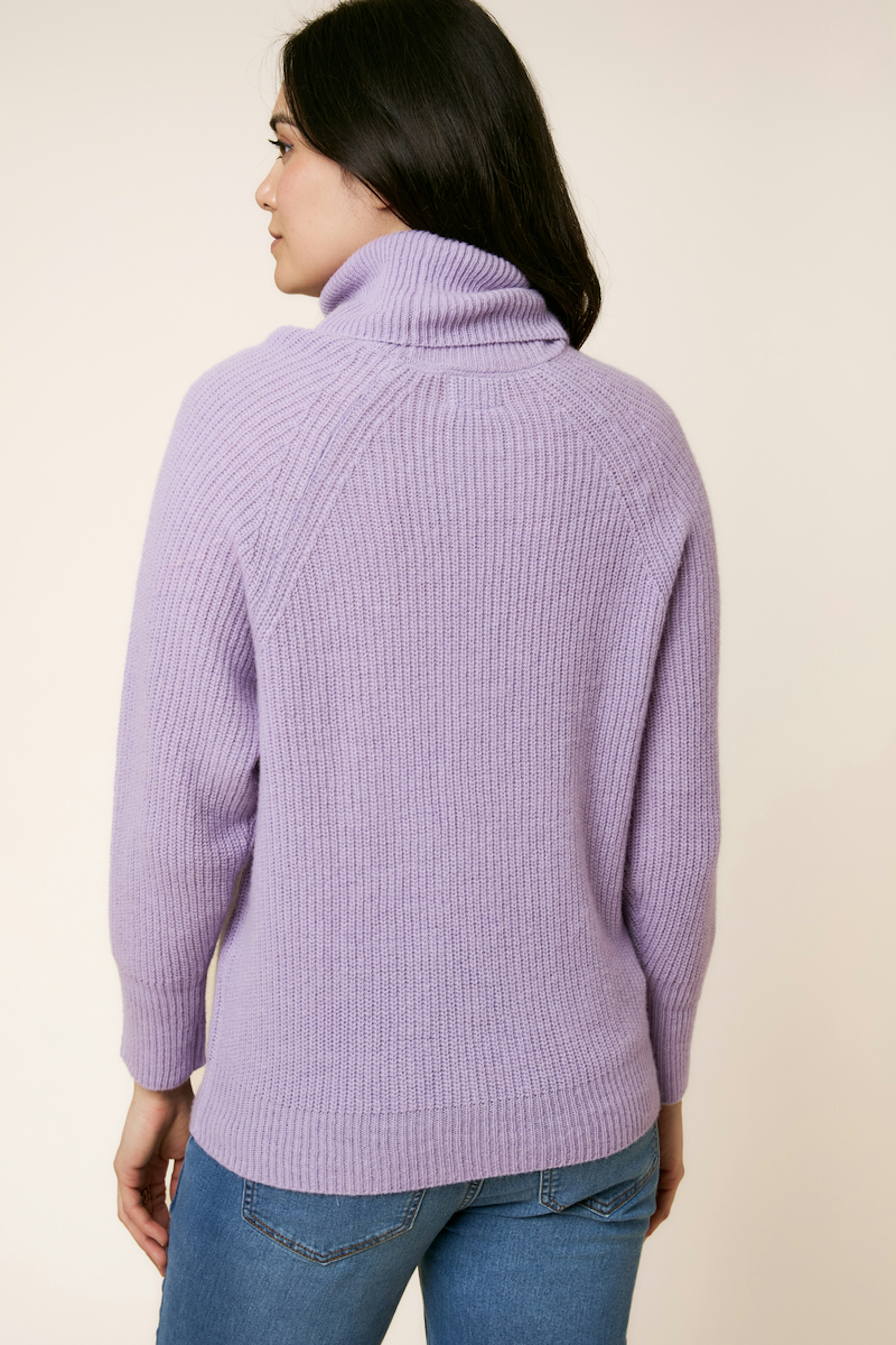 Add a touch of softness to your outfit with raw jeans and leather ankle boots for a cozy and trendy winter look. • Loose fit • Long sleeves • Turtleneck • Bright purple color • Discreet nursing openings