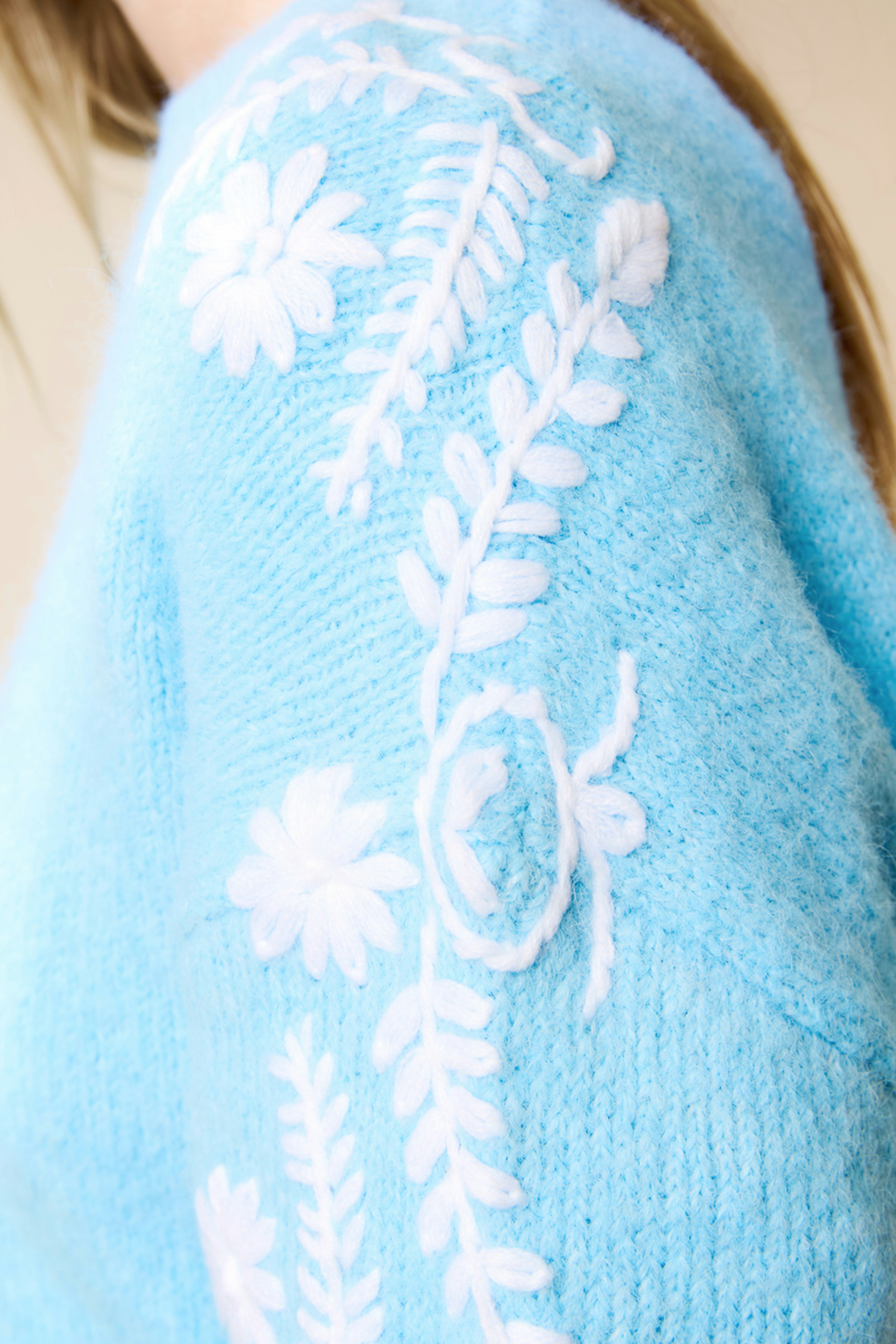 Team this blue pull with gray wool pants for a warm, modern winter look. • Soft and fluffy pull • Classic round neck • Relaxed long sleeves • Delicate floral pattern • Loose and comfortable fit