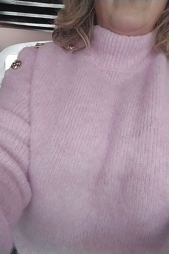 This pink pull perfectly pairs with black jeans for a chic yet laid-back vibe, ideal for those winter days. • Mixed wool pull • Stylish high collar • Cozy long sleeves • Comfy and fluffy fit • Decorative golden buttons