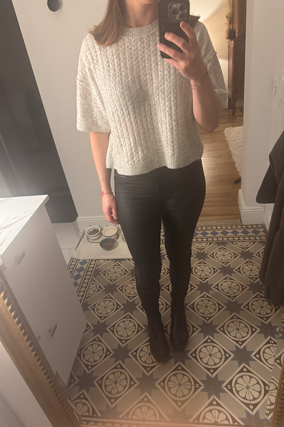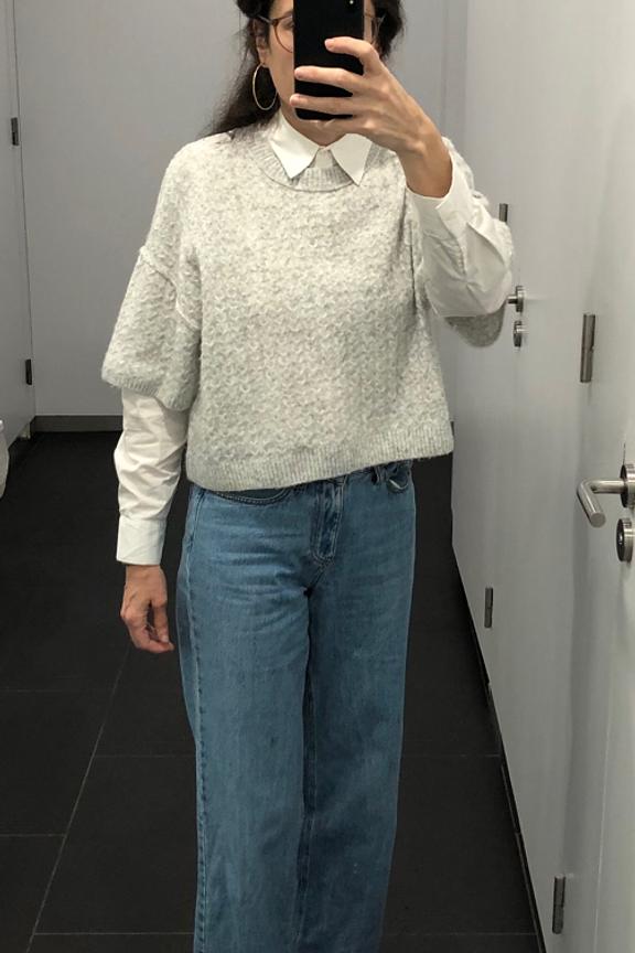Pair this gray pullover with slim jeans and ankle boots for a casual chic vibe; perfect for those crisp winter days. • Short-sleeved pullover • Relaxed fit • Round neck • Twisted knit texture • Versatile gray color
