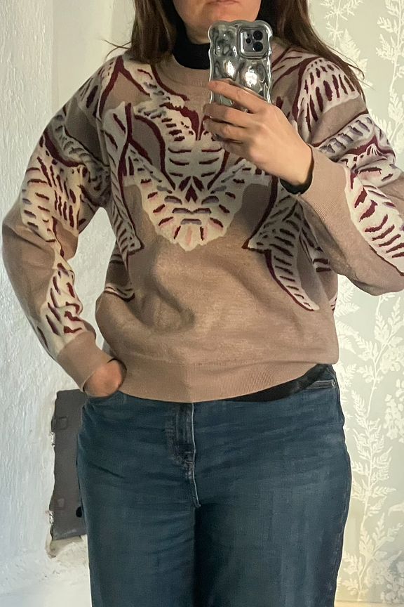 Style this sweater with slim jeans and ankle boots for a chic and casual winter outfit. • Wool sweater • Loose fit • Long sleeves • Round neck • Printed pattern