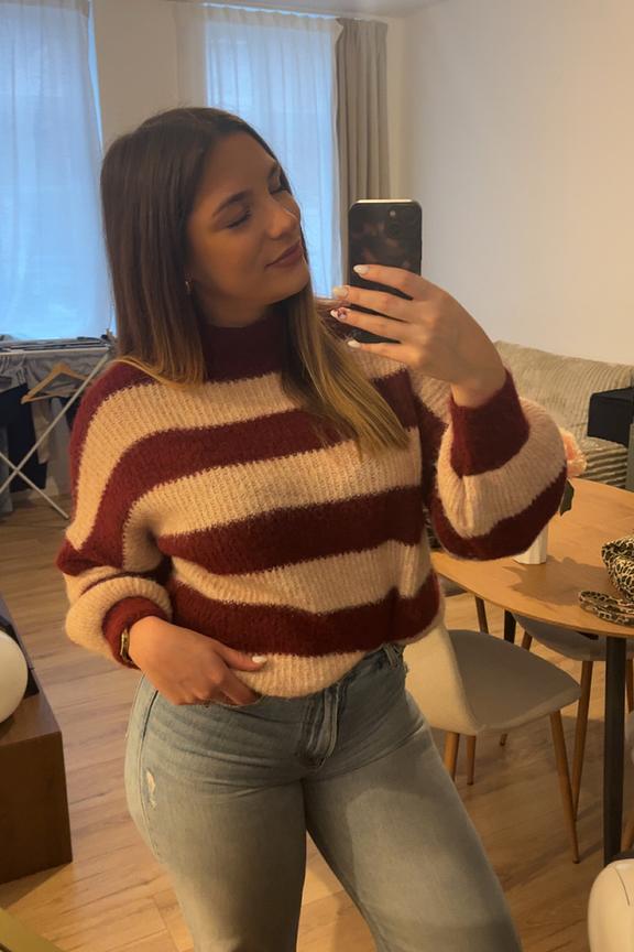 Choose this striped pull with high-waisted jeans and elegant ankle boots this winter for a casual chic look. • Striped pull • Loose fit • Long sleeves • High neck • Stripe pattern