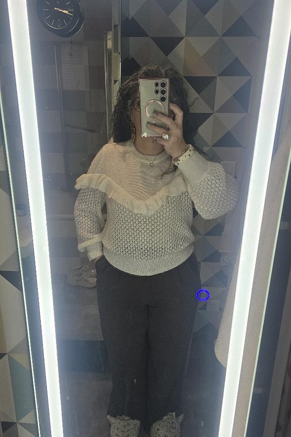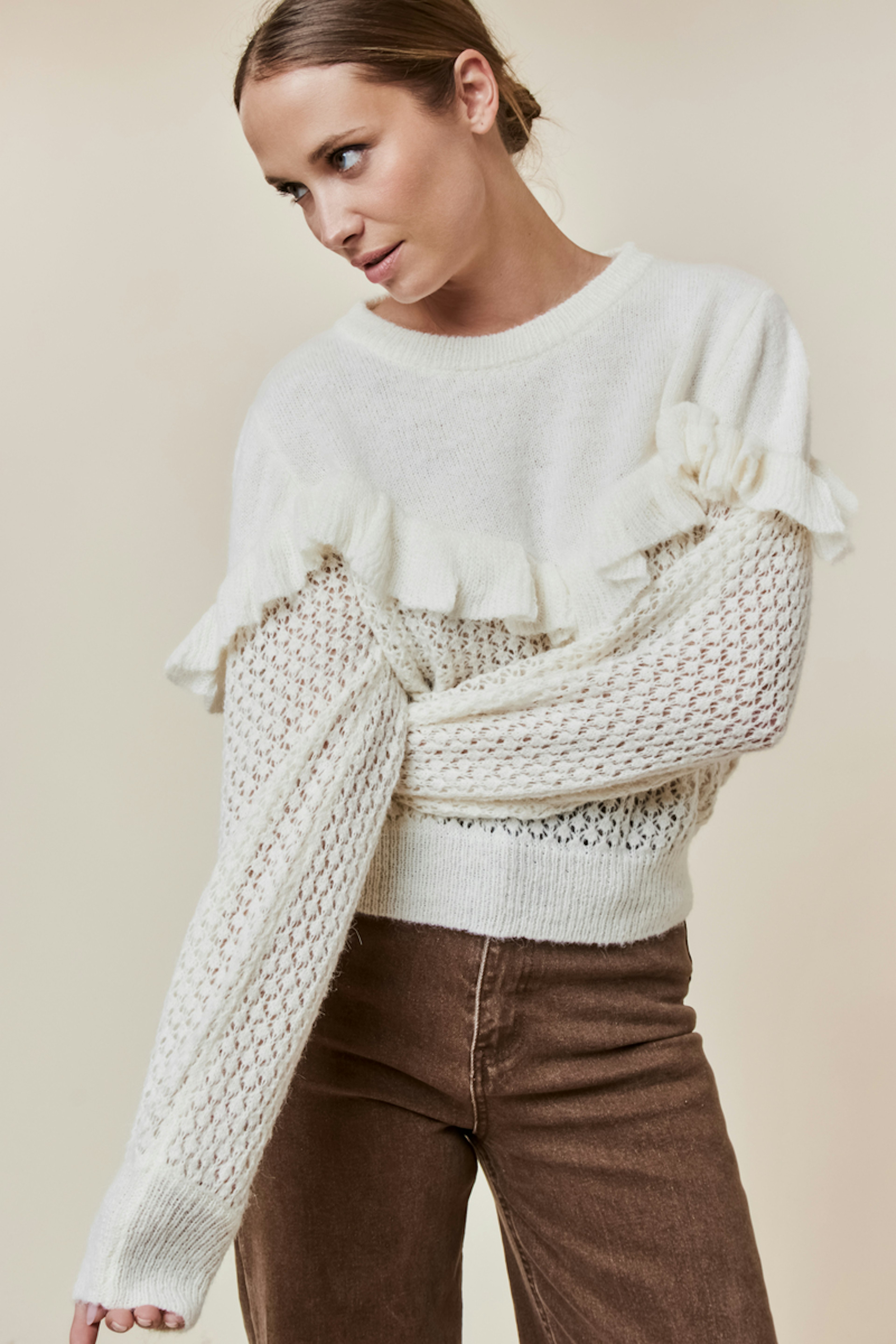 Style this textured pull with dark blue jeans for a cozy and chic winter vibe. • Wool pull • Long openwork sleeves • Ruffle at the front • Moderate fit • Crocheted texture