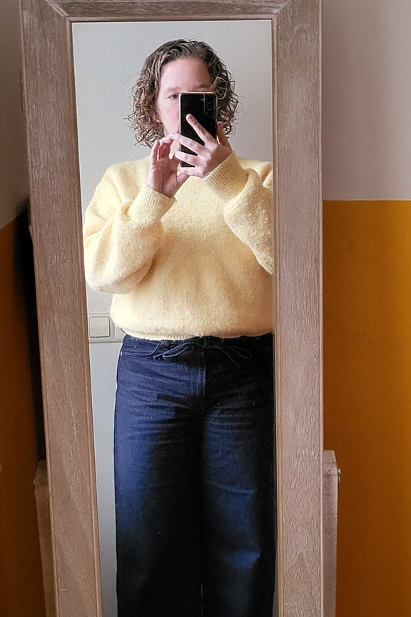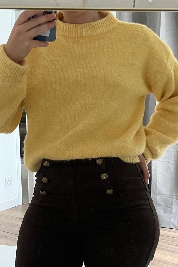 Add a fresh touch to your outfit by pairing this yellow pull with skinny jeans and ankle boots. Perfect for bringing warmth in winter. • Soft, loose pull • Classic round neck • Wide long sleeves • Ribbed finish • Bright and cheerful shade