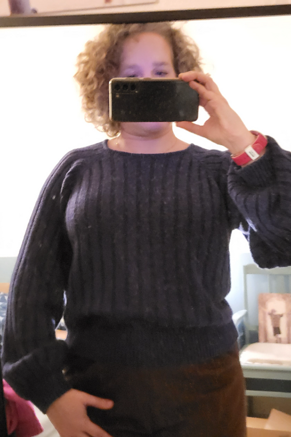 “Basic sweater but with a twist (bell-shaped sleeves, boxy neckline). Lovely material, feels like good quality, very warming. Love the color too.”