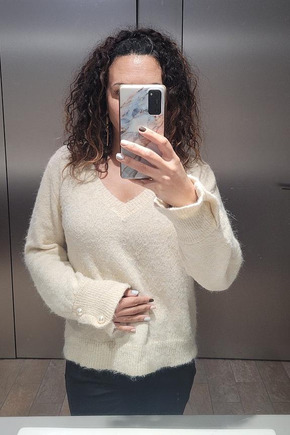 Wear this cozy pull with blue jeans for a casual-chic style this winter. • Soft wool pull • Long sleeves • Relaxed fit • Beaded detail at the cuffs • Elegant beige color