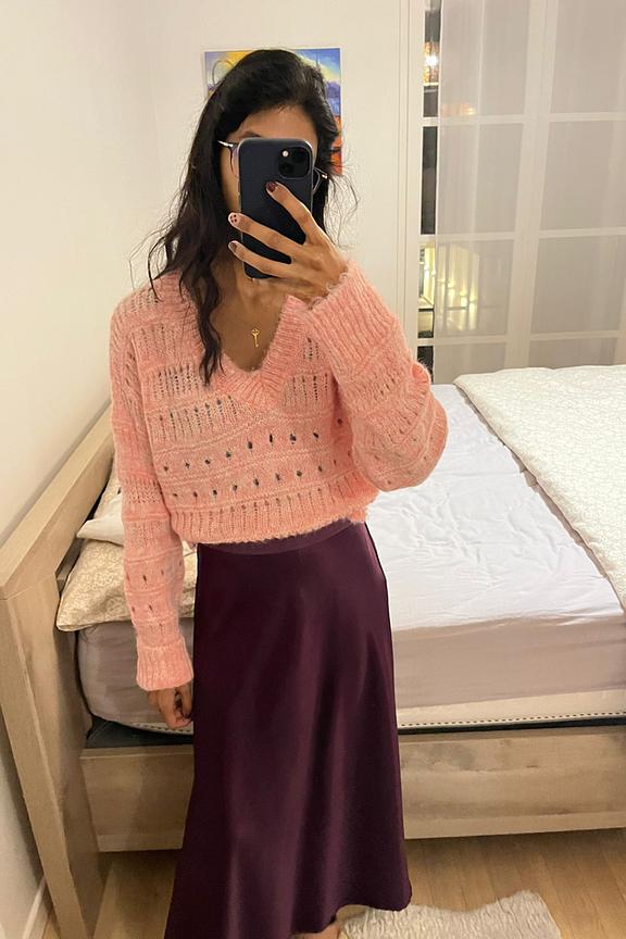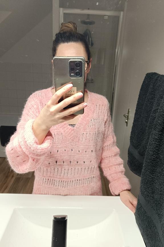 Match this cozy pull with slim jeans and ankle boots for a comfy day. Perfect for chilly winter days. • Fluffy pull • V-neck • Long sleeves • Openwork knit • Delicate pink color