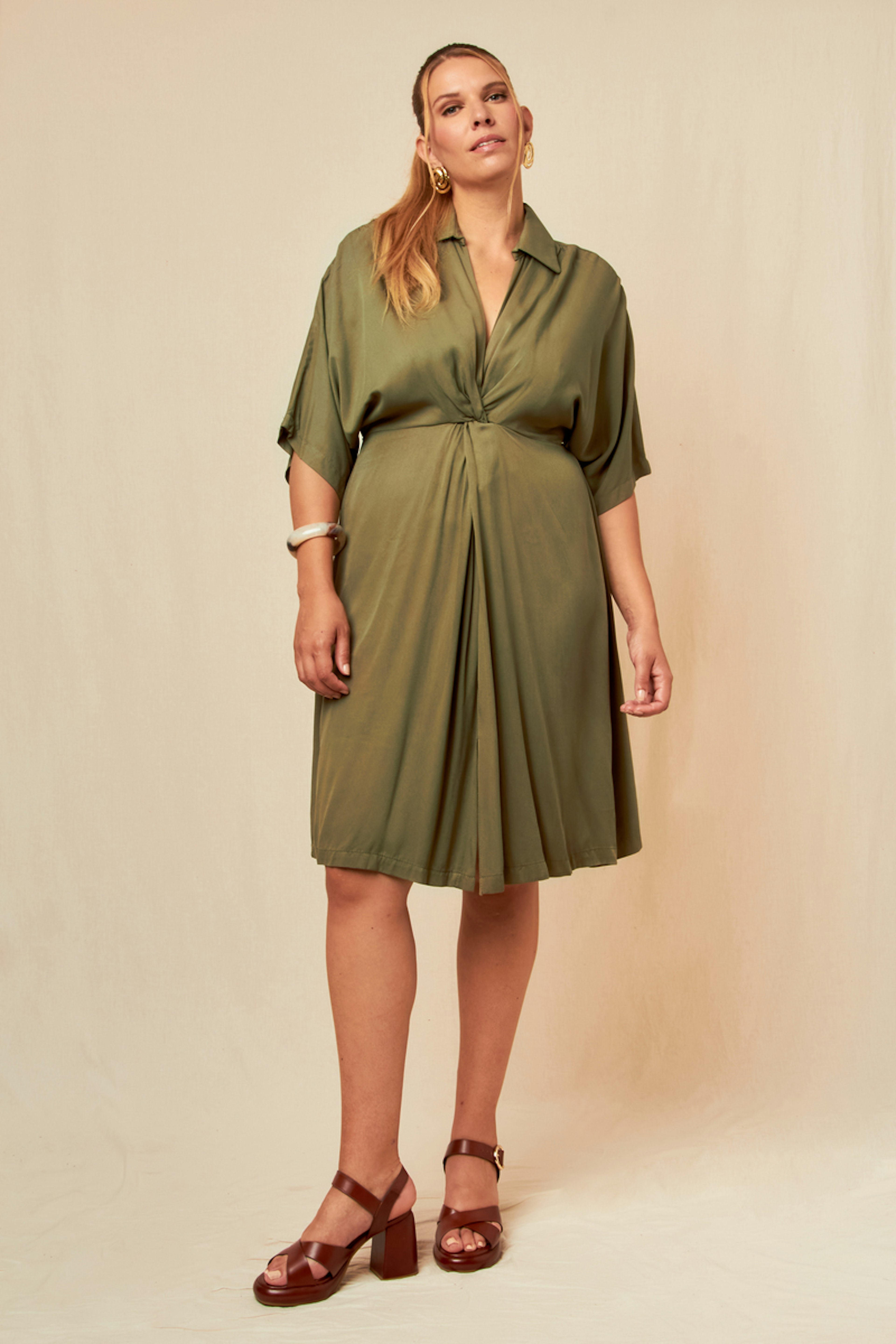 Pair this dress with golden sandals and a wicker bag for a chic summer look. • Short viscose dress • Short sleeves • V-neck • Bow at the waist • Front slit