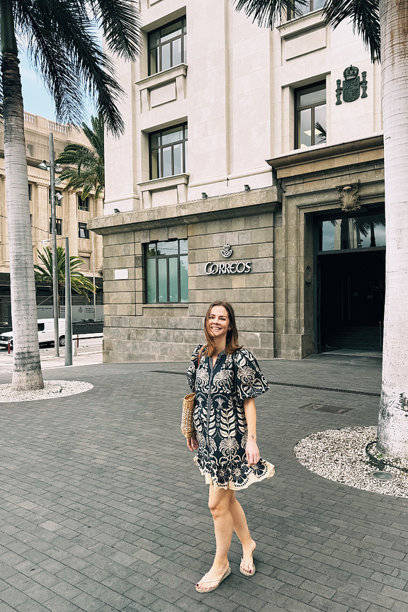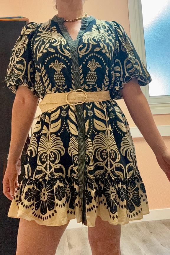 Pair this dress with suede boots and a fedora hat for a bohemian chic look. Perfect for expressing a soft, warm, and playful style that reflects you. • Short dress • Puff 3/4 sleeves • Belted waist • High neckline • Tropical pattern