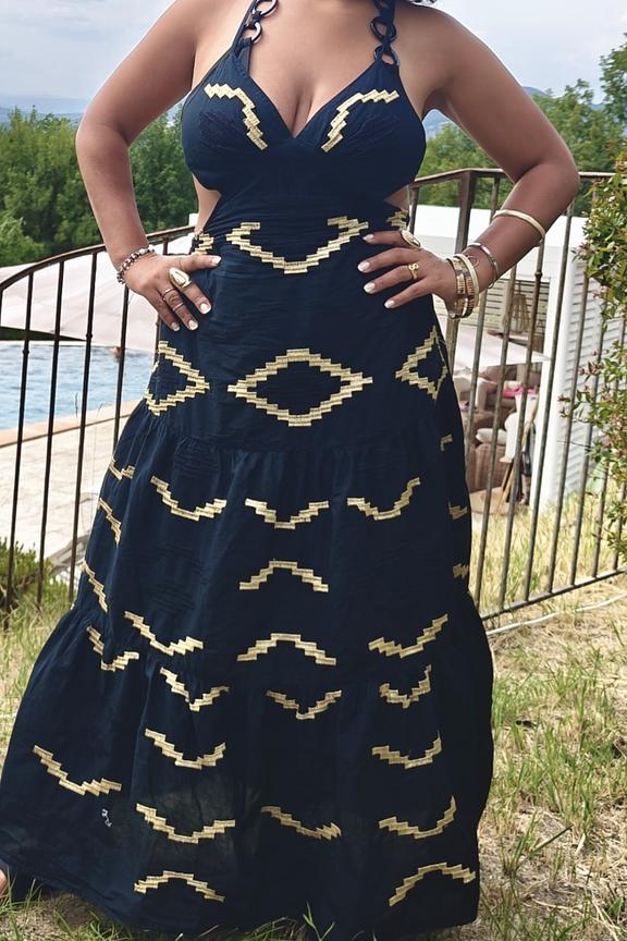 Stunning dress, elegant and festive, it will wonderfully dress up your summer wardrobe. • Long cotton dress • Deep V-neck • Breast supported and fitted by ties at the back of the dress • Openwork at the waist • Beautiful volume at the bottom of the dress, openworked by a slit • Elastic at the back of the dress • Gold thread embroidery