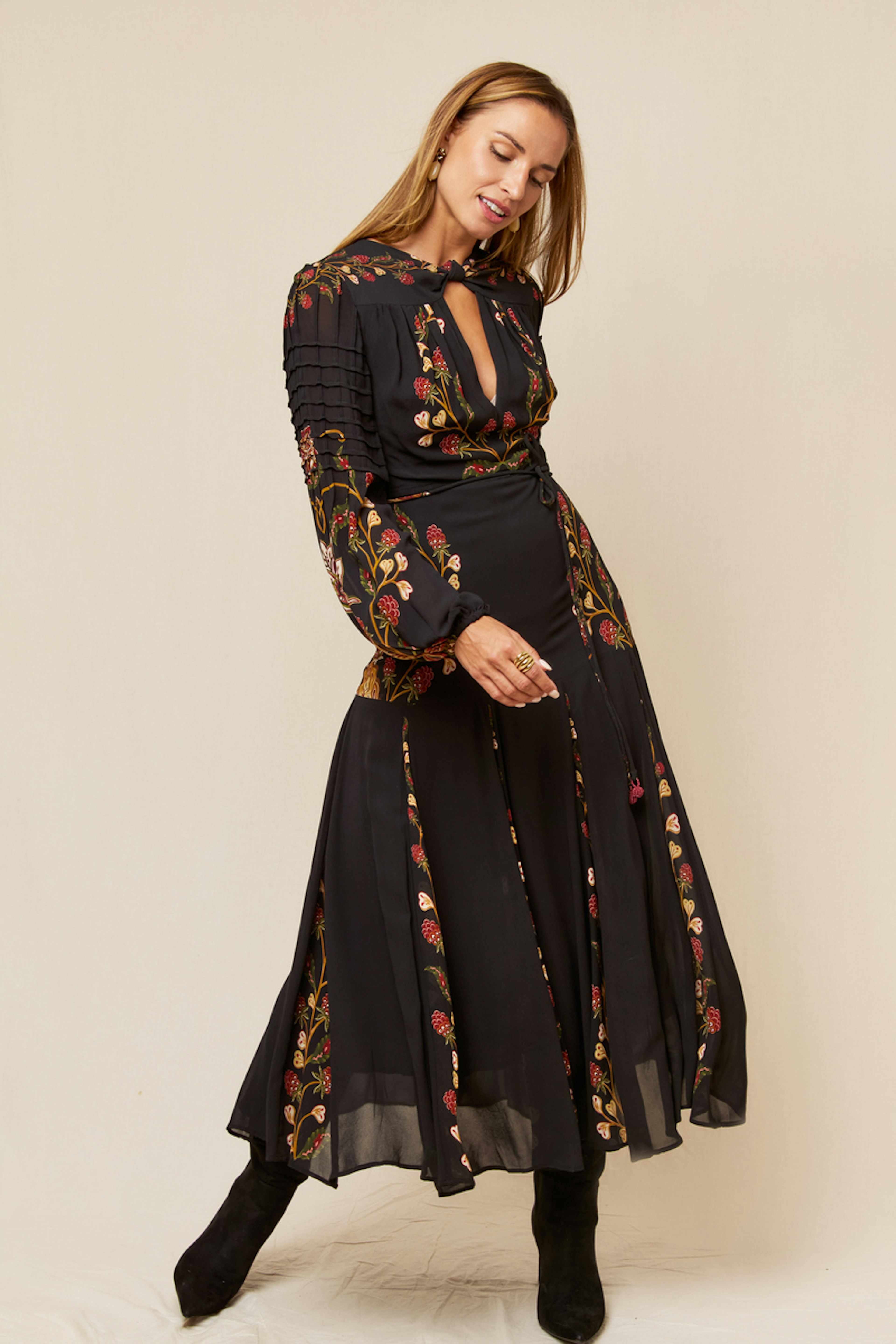 Pair this dress with leather ankle boots and golden hoops for a chic winter look. Perfect for an evening out any season. • Flowing long dress • Bright floral print • Elegant tied collar • Puff sleeves • Gathered waist detail