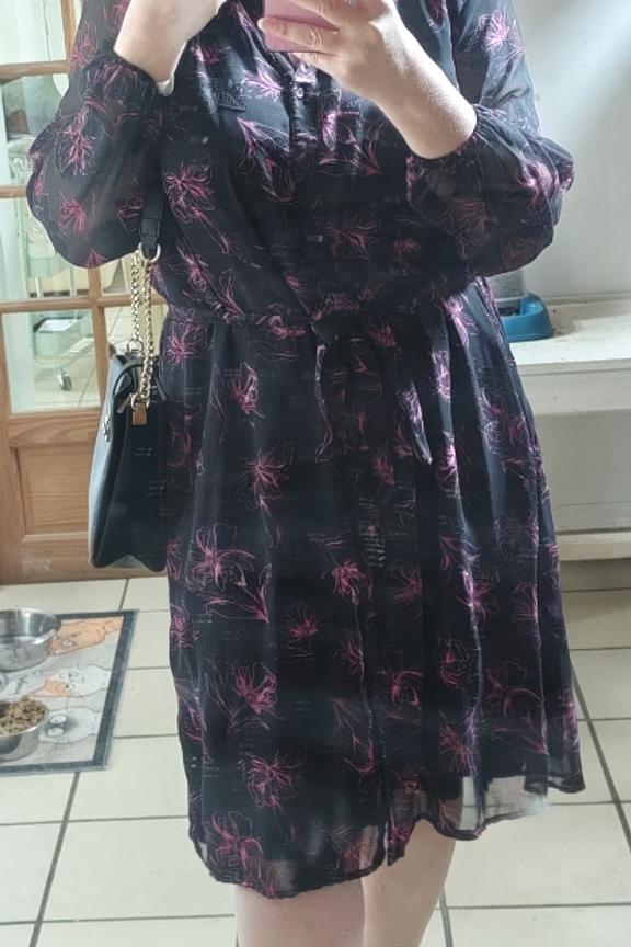 For a chic and elegant look, pair this dress with a pair of leather ankle boots and a structured long coat. Add minimalist accessories for a touch of sophistication. Perfect for cool winter days! • Mid-length dress in polyester • V-neck • Long sheer sleeves • Tie belt at the waist • Floral pattern
