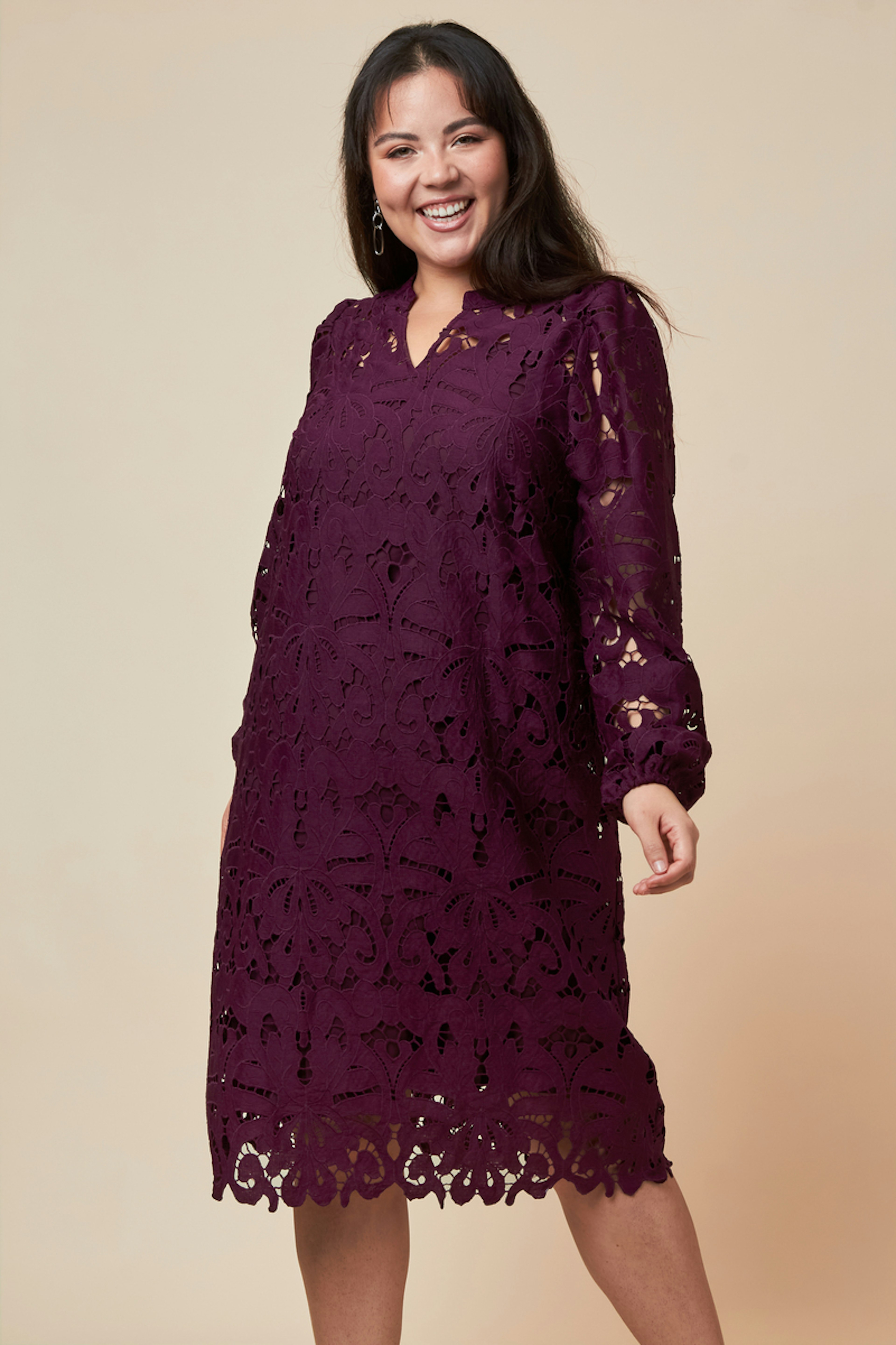 Wear this dress in winter with tall boots and a thick coat for a chic and cozy look. • Short dress • Puffed long sleeves • V-neckline • Floral pattern • Scalloped hem