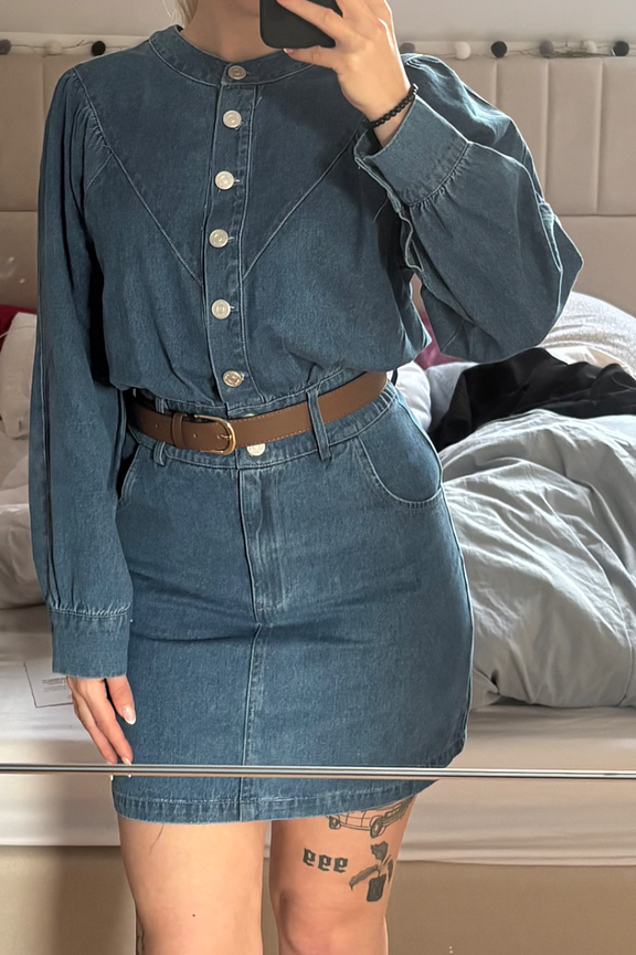 “Very good quality jeans material. Isn’t stretchy at all. The length is nice since it’s short but doesn’t make me feel like I’ll flash people at any given moment. The skirt part fits perfectly, unfortunately I feel like the top part is way too big and puffy in relation to the bottom. Might be a different feeling if you have a bigger chest than me. Still wore it and styled it with a belt, overall I was happy with it :)”