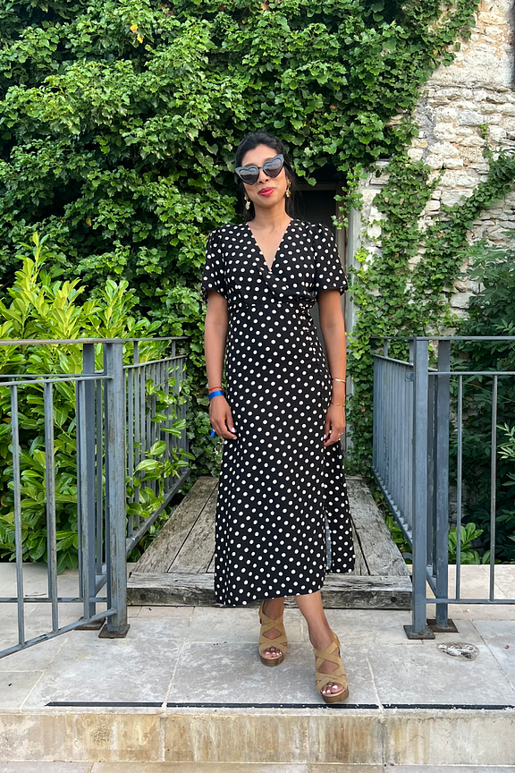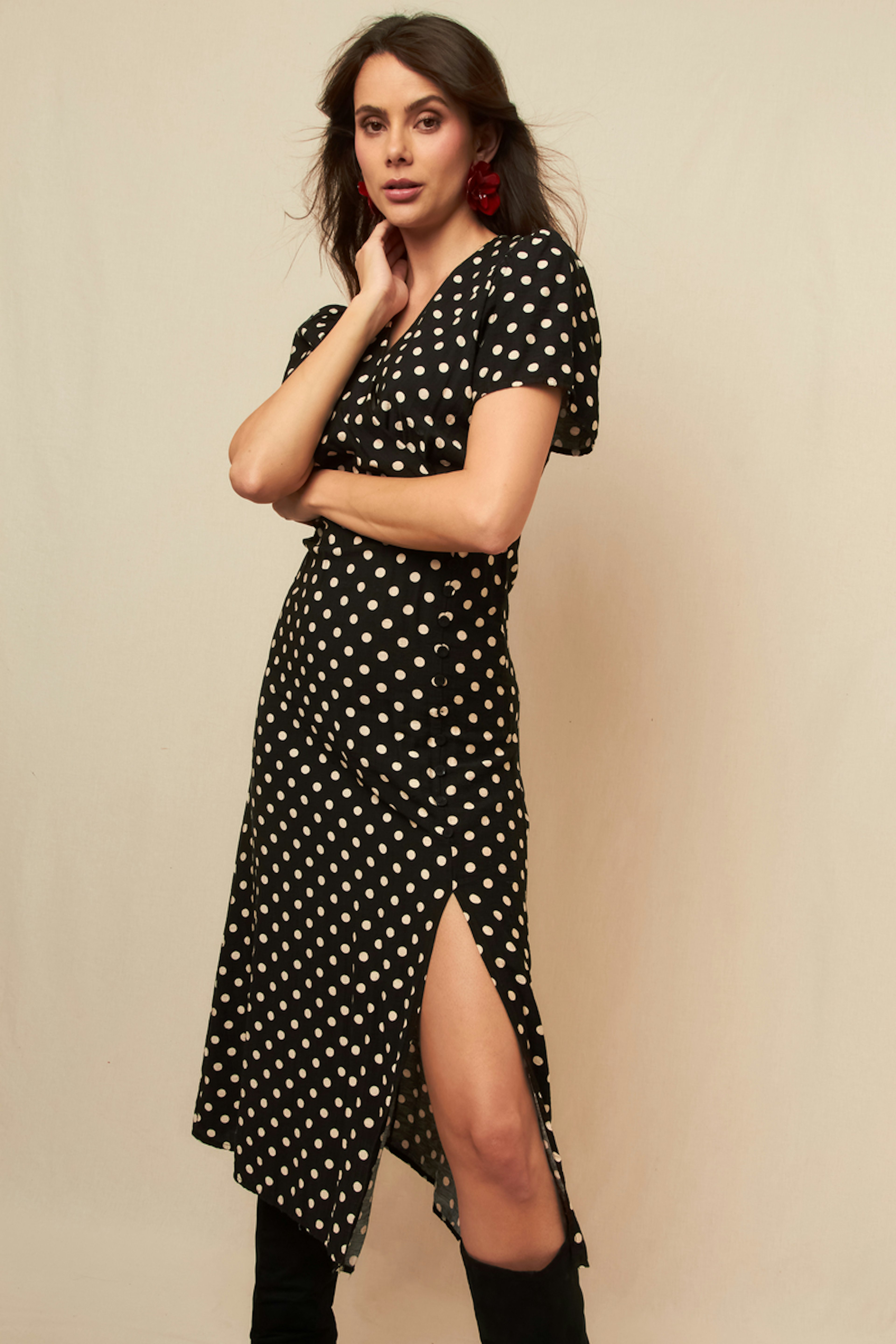 This dress is perfect with sandals and golden accessories for a chic evening summer look. • Wrap dress • V-neckline • Short sleeves • Slit opening • Polka dot pattern