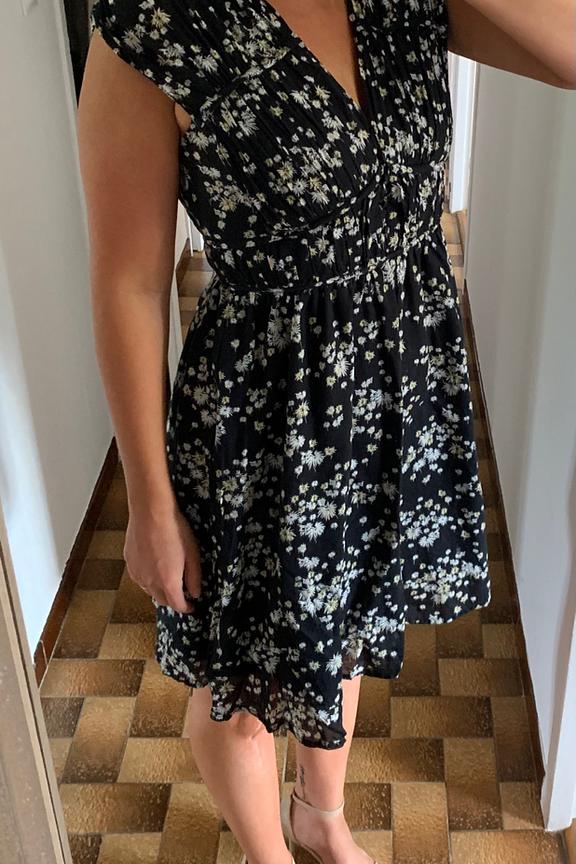 Pair this charming dress with strappy sandals for a chic summer look. Perfect for any season. • Skater dress in cotton • V-neck • Gathered structuring • Short sleeves • Mini length • Floral pattern