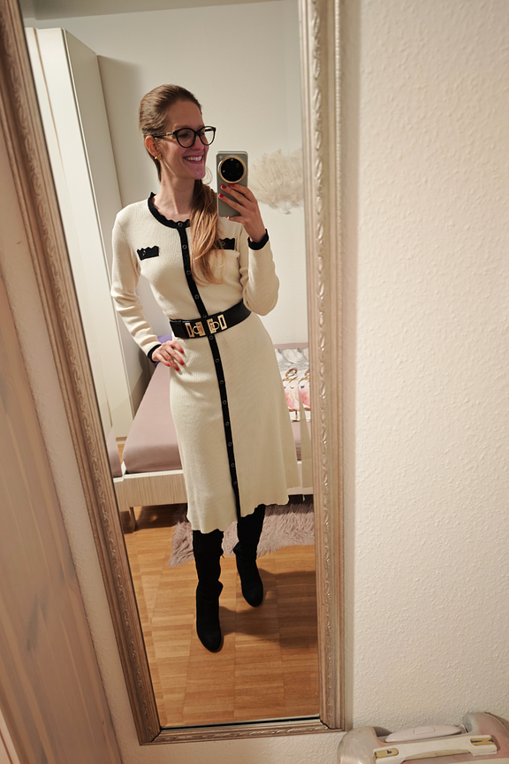 Pair this elegant ecru dress with burgundy leather ankle boots for a sophisticated look, or opt for black pumps for a touch of classic style. Perfect for chilly winter days. • Long dress • Full-length buttoned • Long sleeves • Black contrasting details • Round neck with scalloped finishes