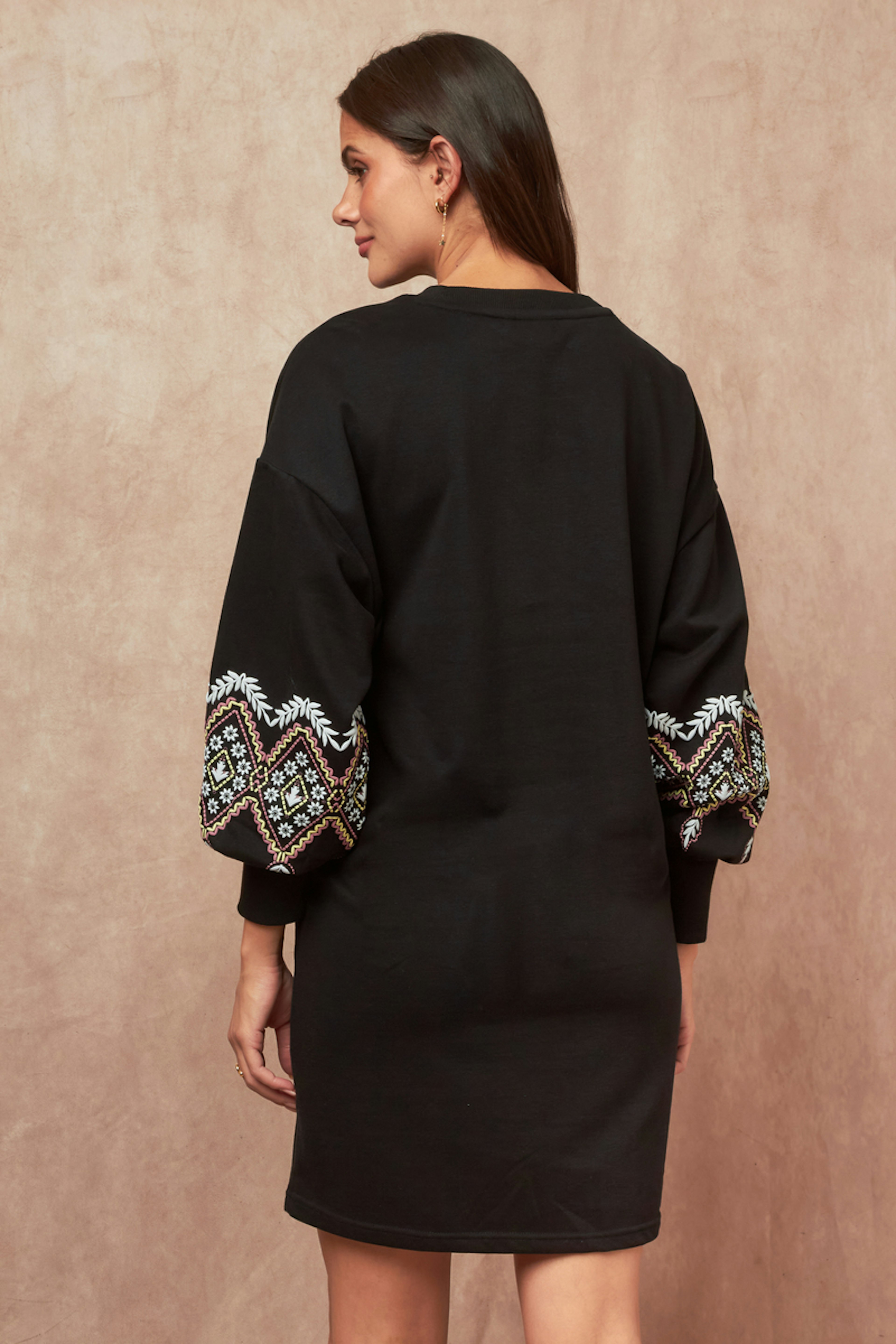 Style this dress with leather ankle boots and ethical accessories for a trendy and comfy outfit. Perfect in any season. • Black dress with sleeve patterns • Comfortable flowy fit • Decorative long sleeves • Classic round neckline • Above-knee hem