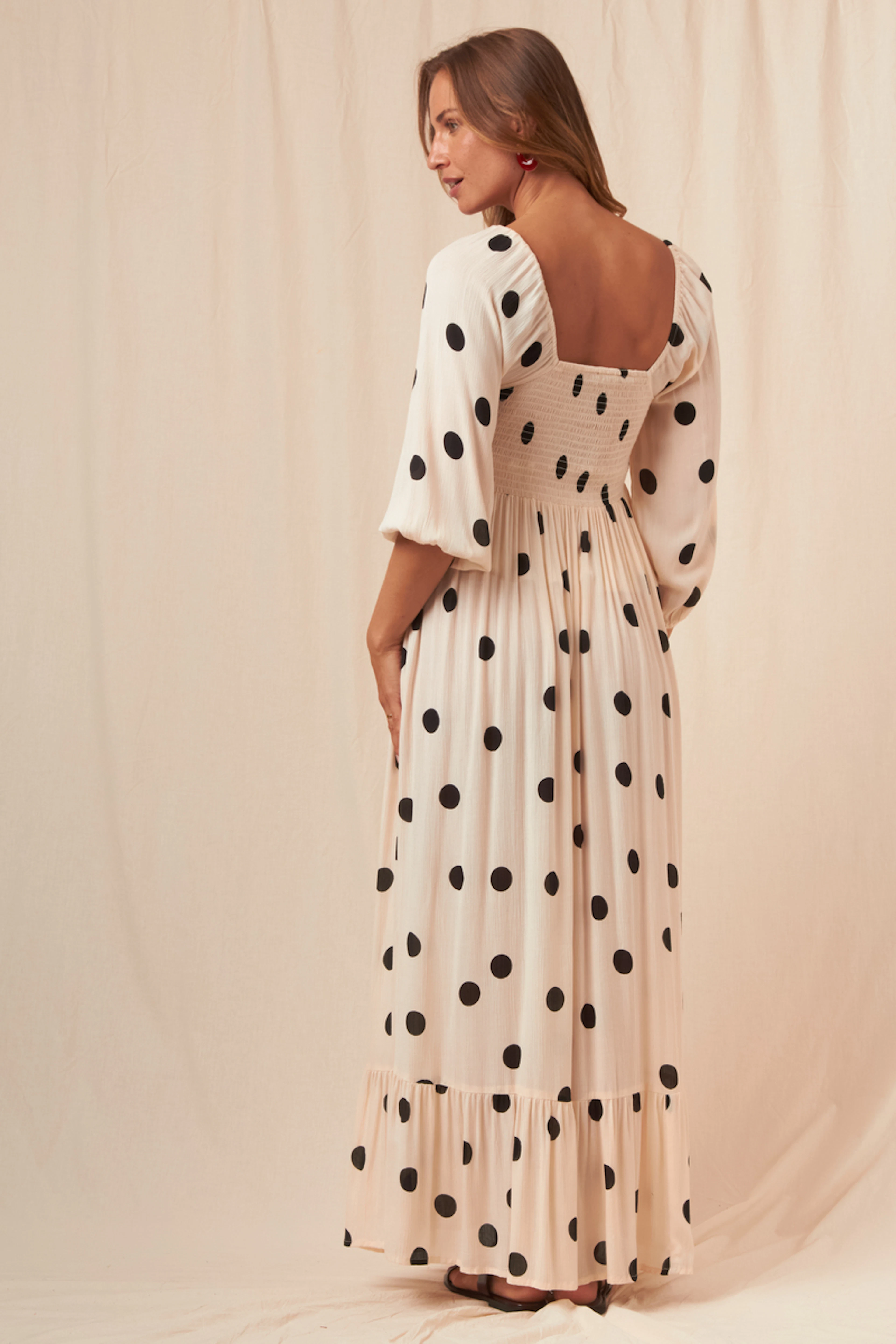 Opt for summer elegance with camel leather sandals and a straw hat. Ideal for a sunny day! • Flowy long dress • Straight cut • Three-quarter puff sleeves • Square neck • Polka dot pattern