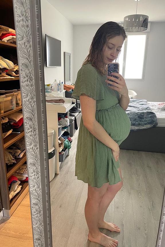 “Very beautiful color and beautiful dress in general but shorter than in the photo (especially behind!) and not possible to wear 8 months pregnant. Too bad”