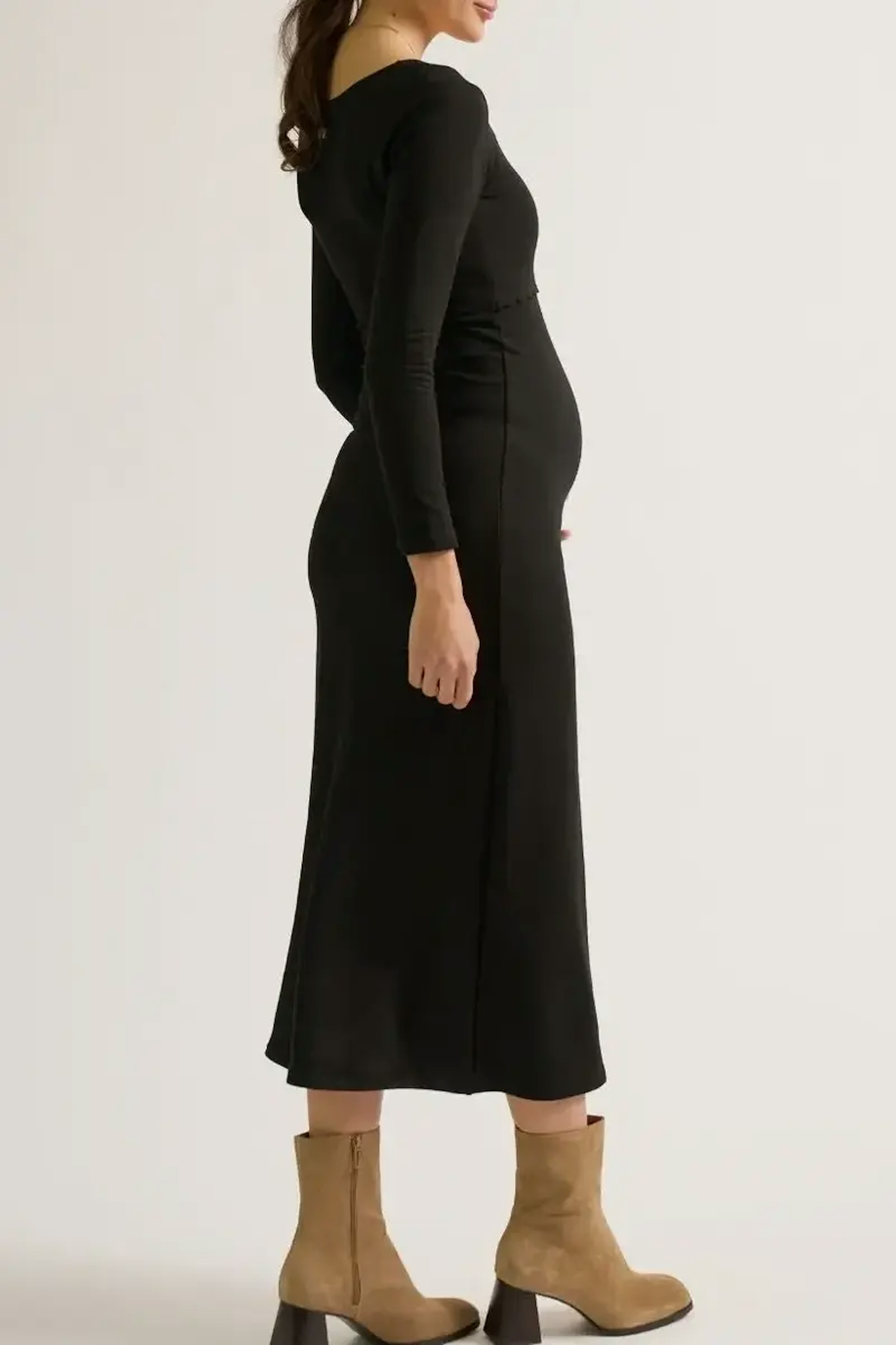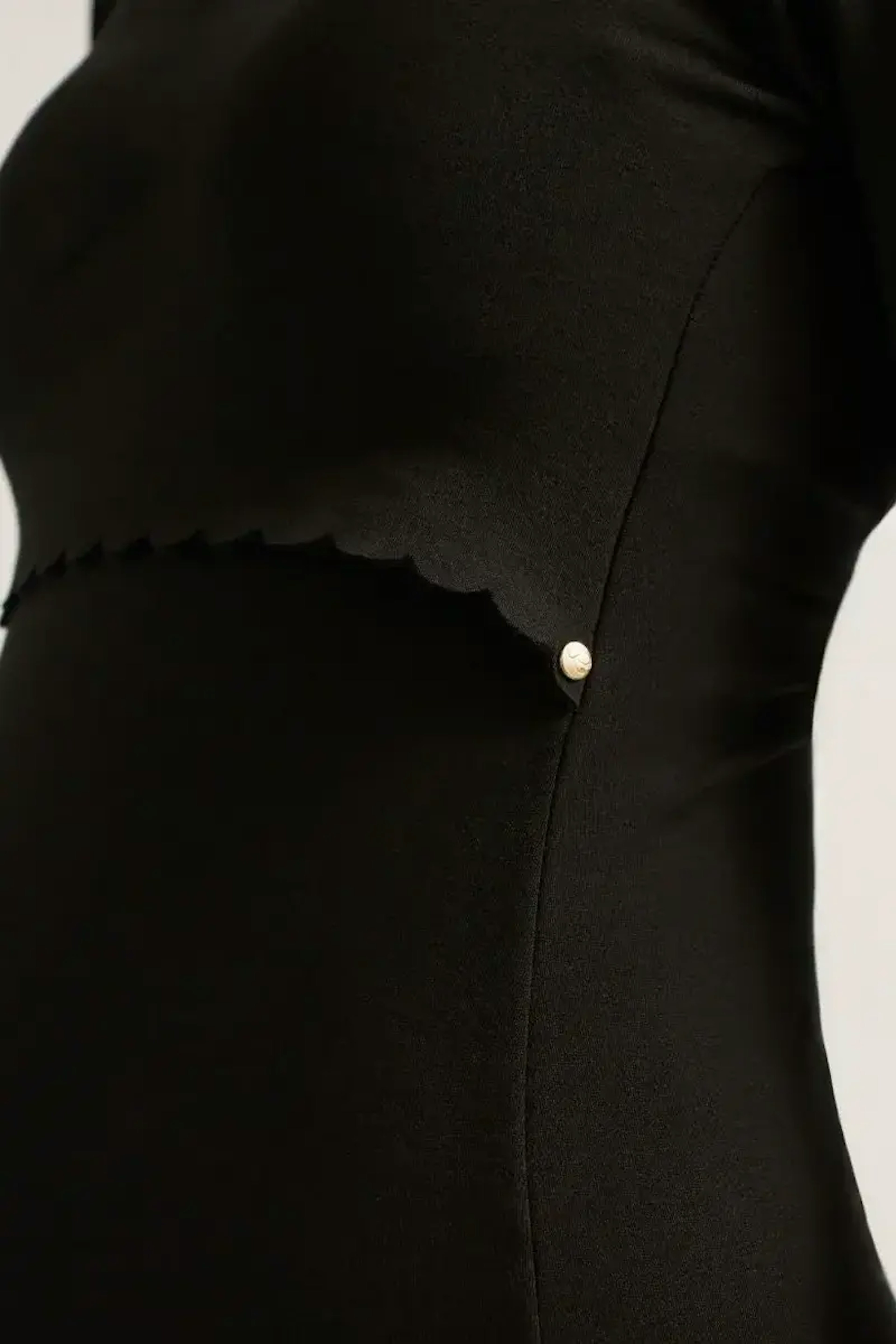 Rock this elegant black dress with ankle boots and a cozy wool scarf for a chic winter look. • Cotton dress • Fitted silhouette • Round neckline • Long sleeves • Stylish black design