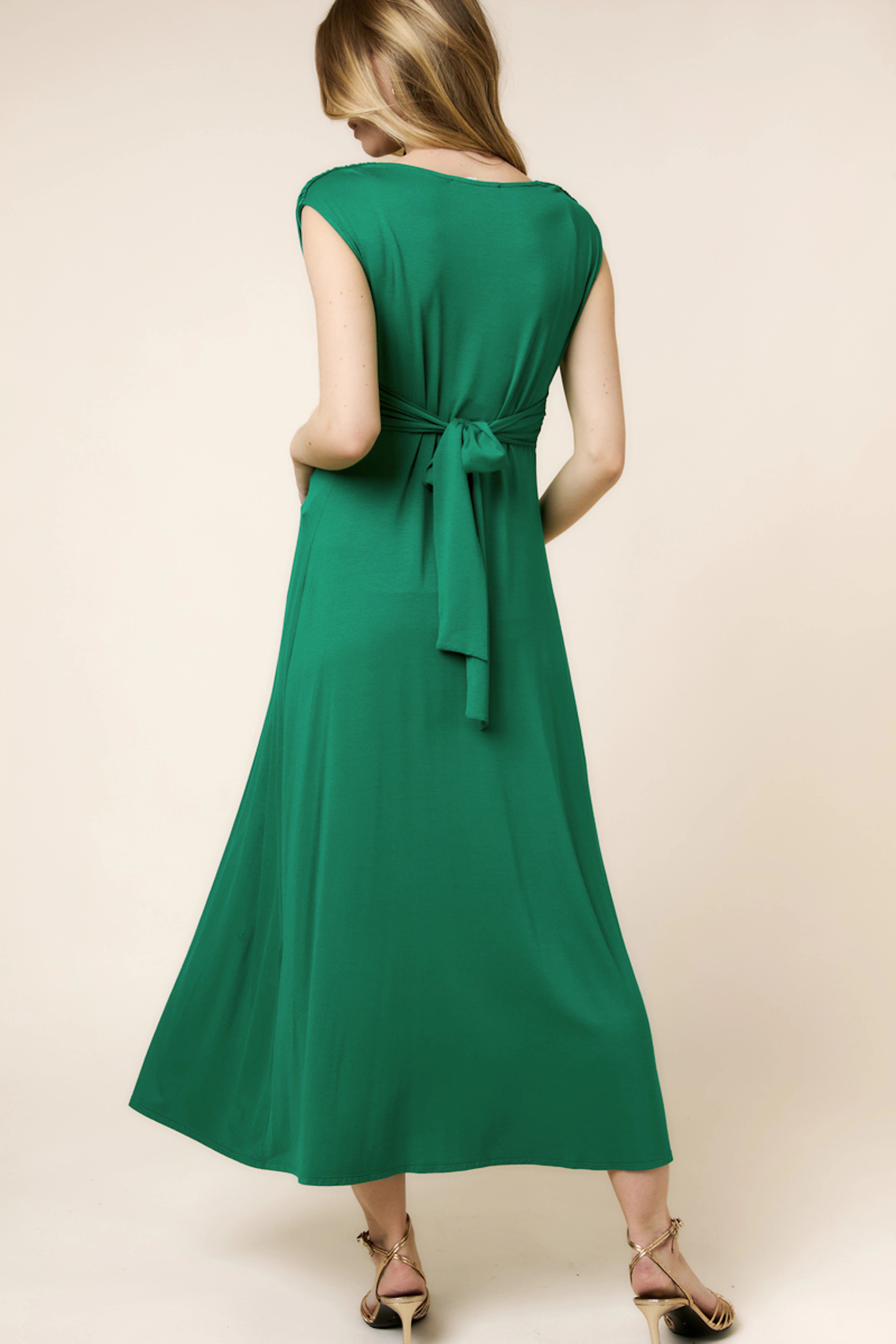 Wear this elegant dress with golden sandals and a straw hat for a refined summer look. • Flowing long dress • Flattering V-neckline • Elegant central bow • Sleeveless • Soft and stretchy material